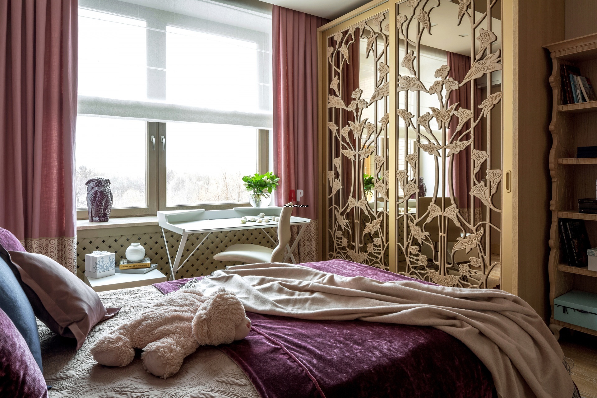 Спальня младшей дочери исполнена в насыщенных бруснично-лиловых оттенках. Кровать с изголовьем из бархата цвета розового жемчуга, Creazioni. Шкаф с зеркальными раздвижными дверями и декоративной резьбой с цветочным рисунком, Halley.