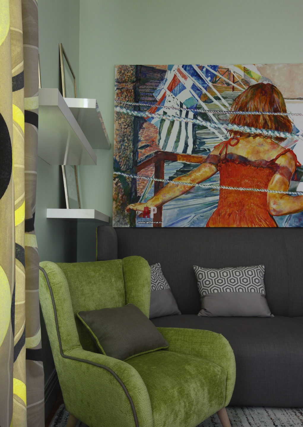 Кабинет младшей дочери. Стены выкрашены краской Benjamin Moore лаймового цвета. Кресло, диван, подушки сделаны на заказ в компании Loffilab. Картина Сергея Базилева «Сен-Мало», 2010 год.