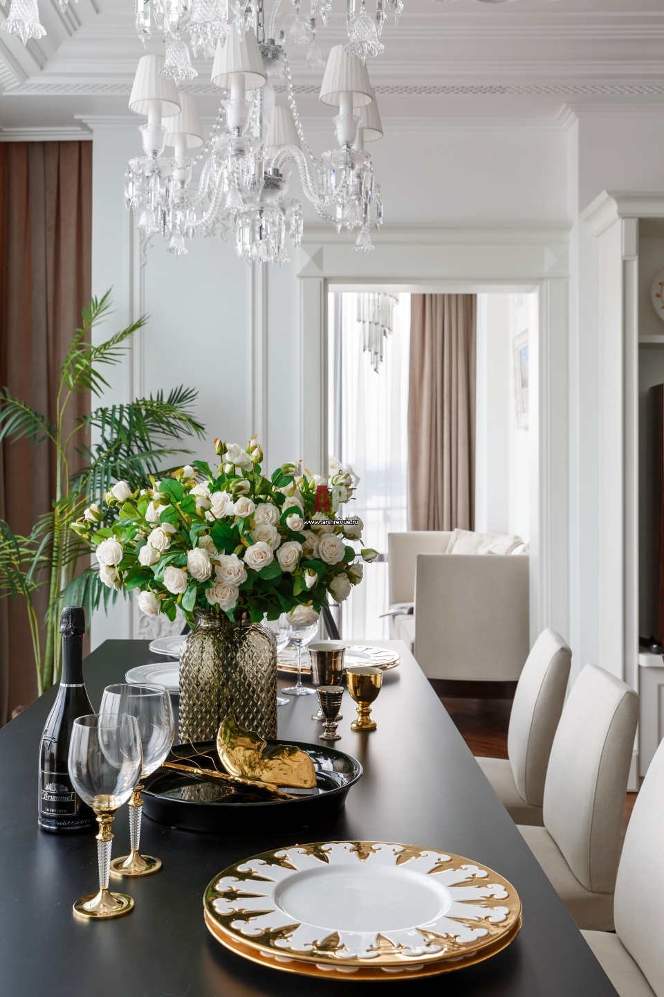 Панорамная квартира с классическим декором. Вид из столовой на лаундж на балконе. Хрустальные люстры с колокольчиками, Schonbek.