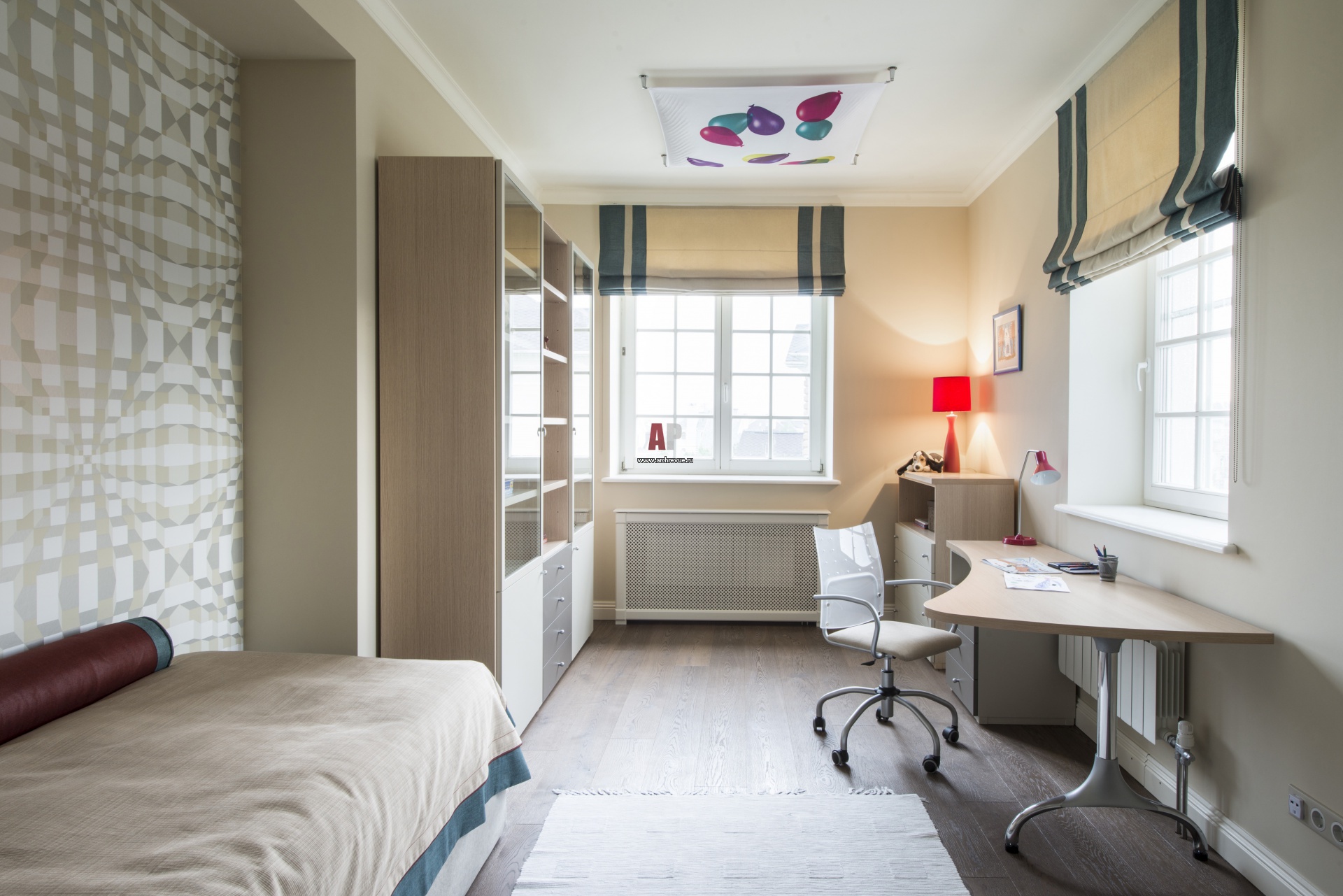 Фото интерьера современной детской комнаты в нейтральной серо-бежевой цветовой гамме. Стена за кроватью оклеена обоями с оптическим рисунком.