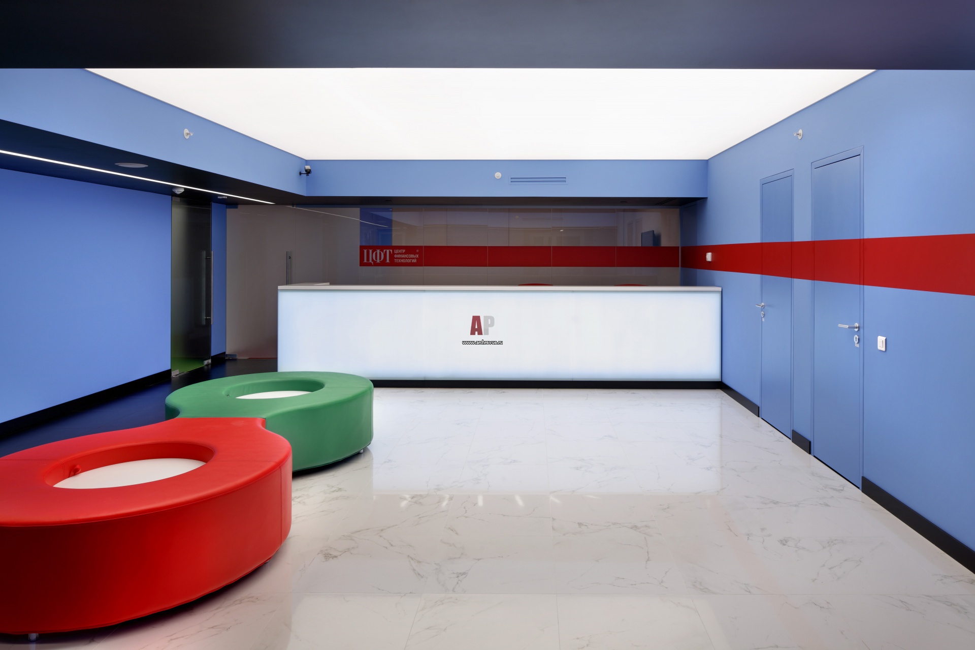 Интерьер входной зоны современного офиса. Чтобы зрительно скорректировать небольшую высоту помещения, потолок с закрепленными светильниками закрыт специальным пропускающим свет полотном. Для отделки пола использовано покрытие с хорошо отражающей поверхностью.