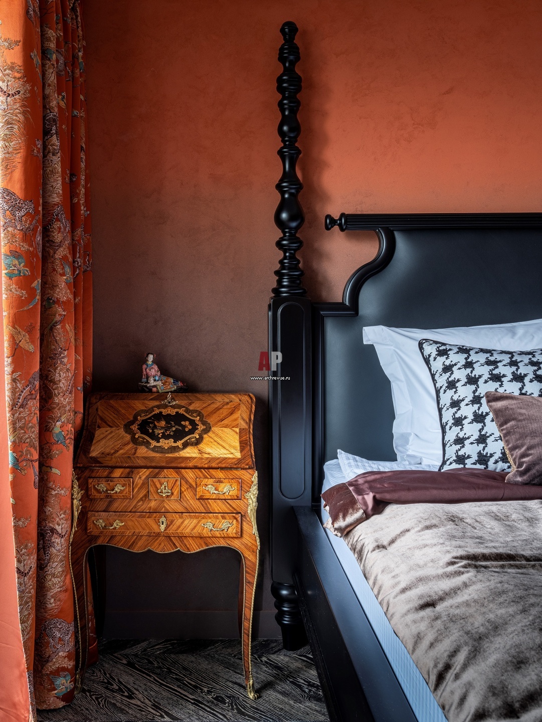 Хозяйская спальня оформлена в историческом стиле. Секретер с инкрустацией деревом и латунью, антиквариат, Франция.