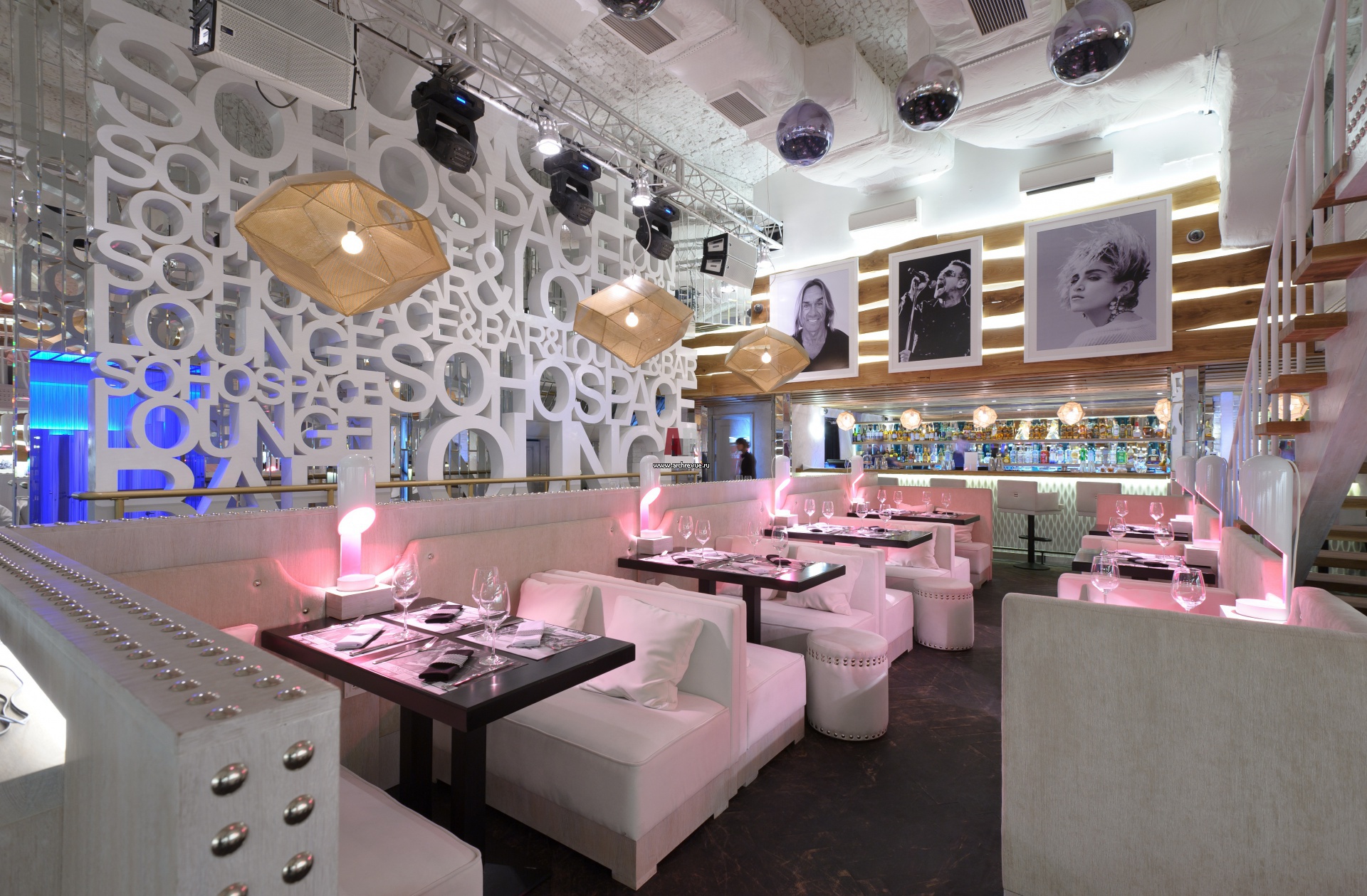 Фото клубной зоны белоснежного интерьера. Скульптурная стена из букв зонирует общий зал. Она сложена из легкого пенопласта и отделана жидким пластиком, придающим изделию прочность и презентабельный внешний вид.