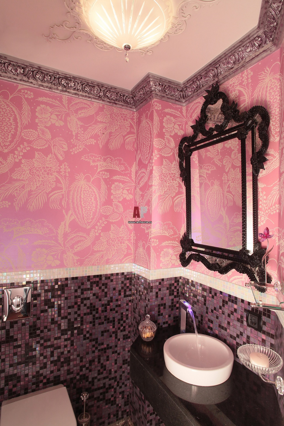 Гостевой санузел в ар-деко облицован розовой и черной мозаикой.