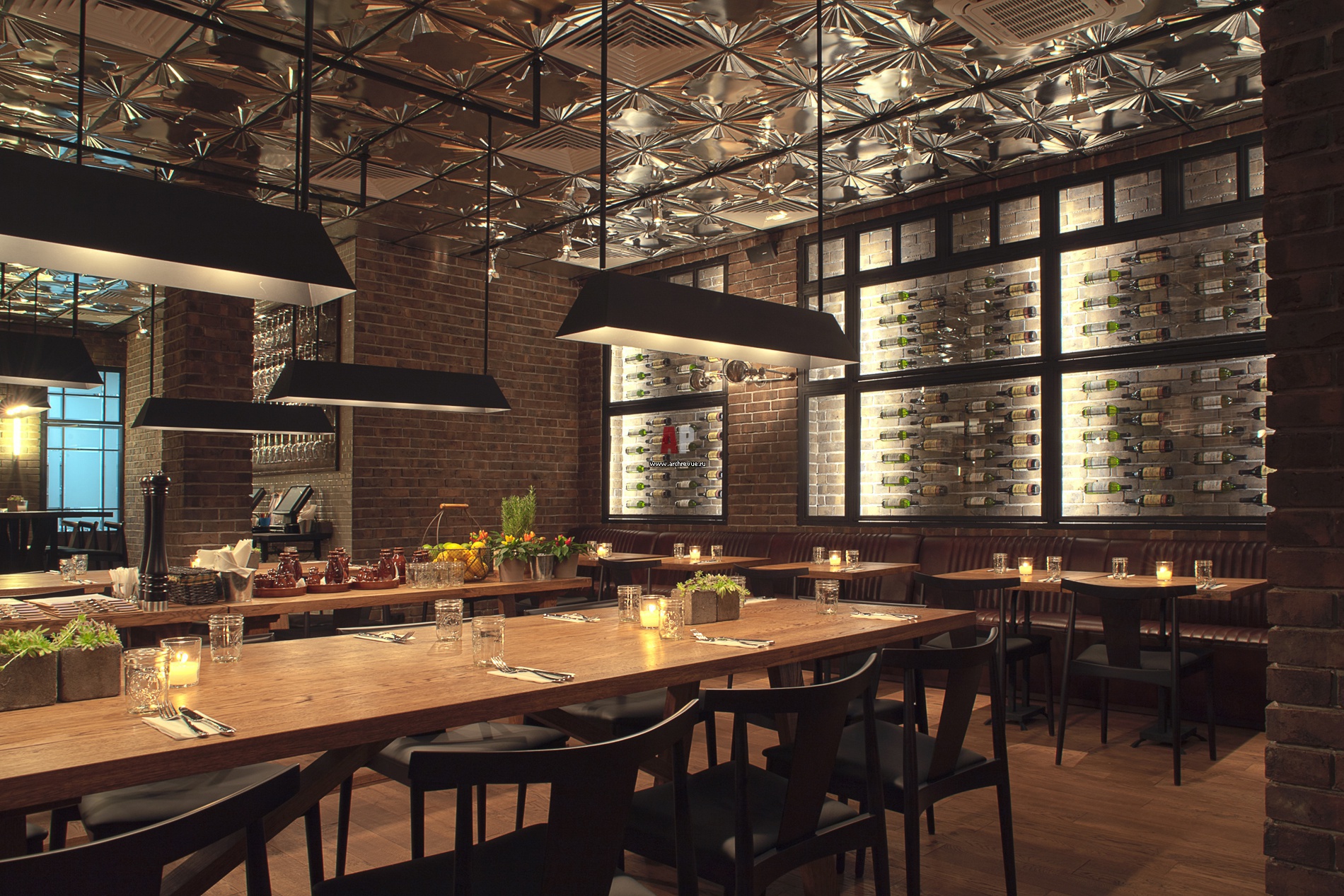 Фото интерьера зала ресторана-пиццерии в стиле фьюжн.