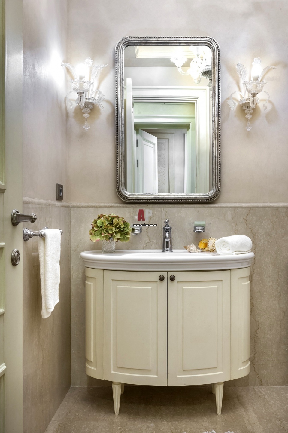 Интерьер гостевого санузла. Низ стен облицован мрамором Botticino Classico. Раковина, Villeroy & Boch, модель Amadea.