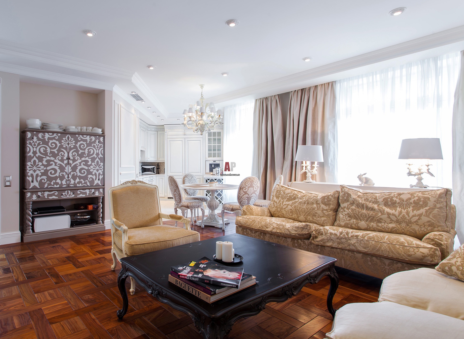 Фото интерьера классической гостиной с итальянскими мотивами. Со светлыми стенами и золотистой мебелью контрастирует паркет цвета красного дерева.