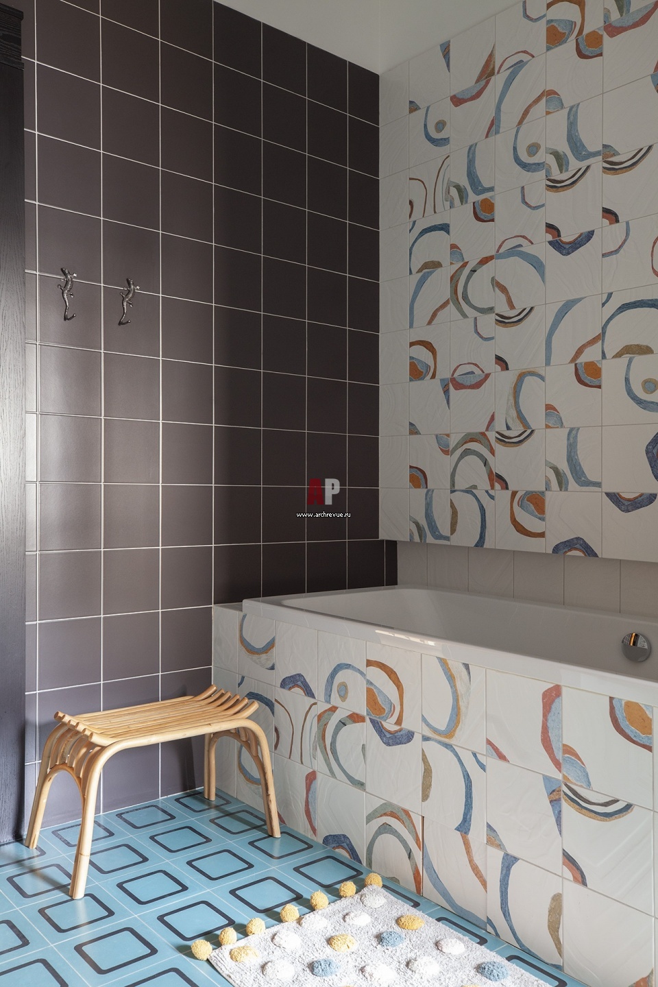 Детская ванная комната с яркой абстрактной плиткой. На полу – цементная плитка бирюзового цвета, Cezzle.