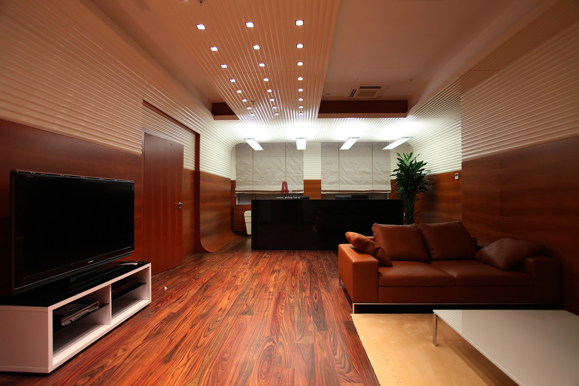 Приемная генерального директора компании. Стены зашиты деревянными панелями из тонированного шпона клена. Верхняя часть стен и потолок оформлена оригинальными гофрированными панелями из дерева, выкрашенного в цвет слоновой кости. Работы по дереву, Bene.