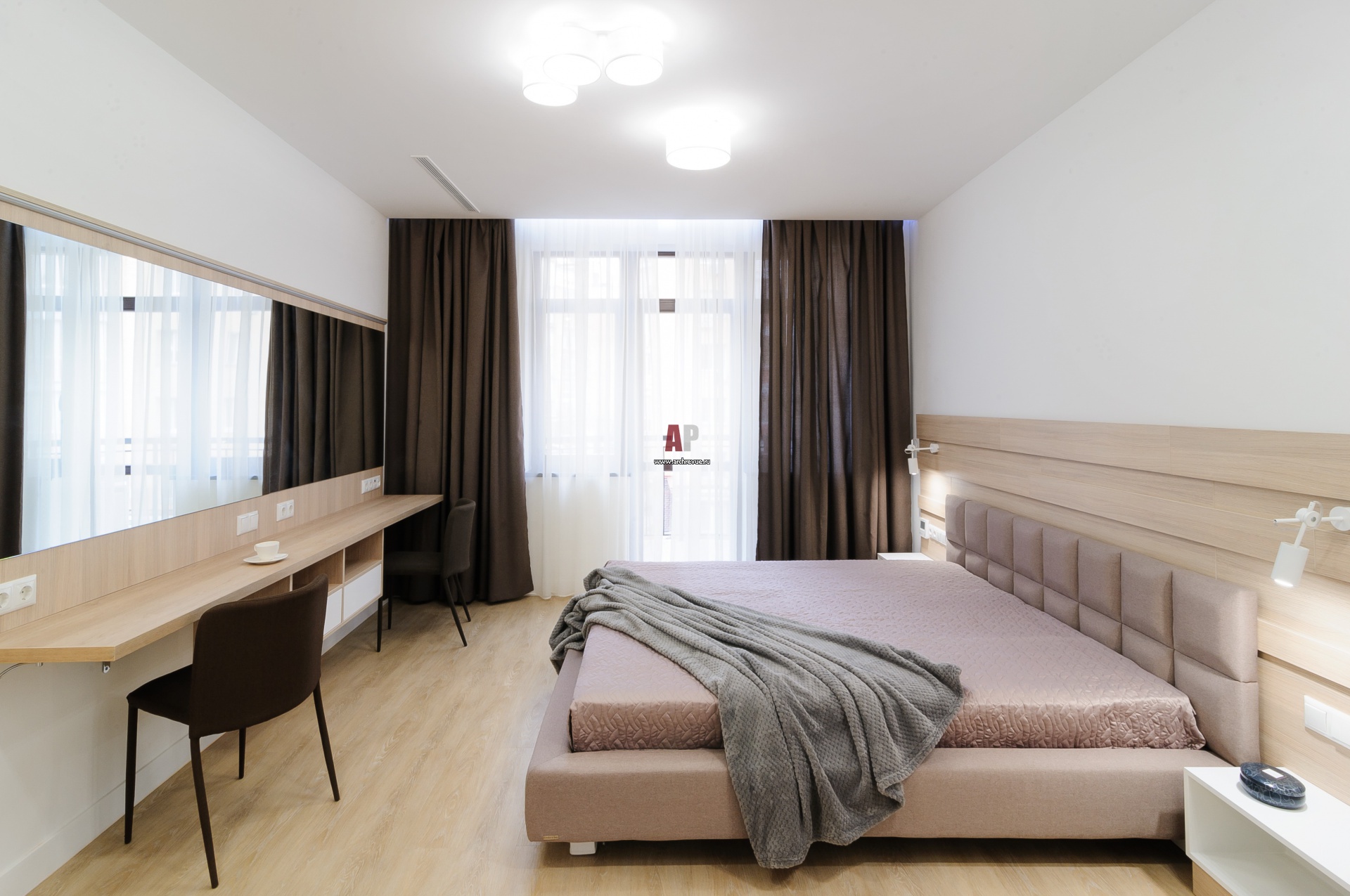 Кровать с длинным деревянным изголовьем рифмуется с вытянутой консолью зеркала напротив. Мебель из массива дуба сделана на заказ.