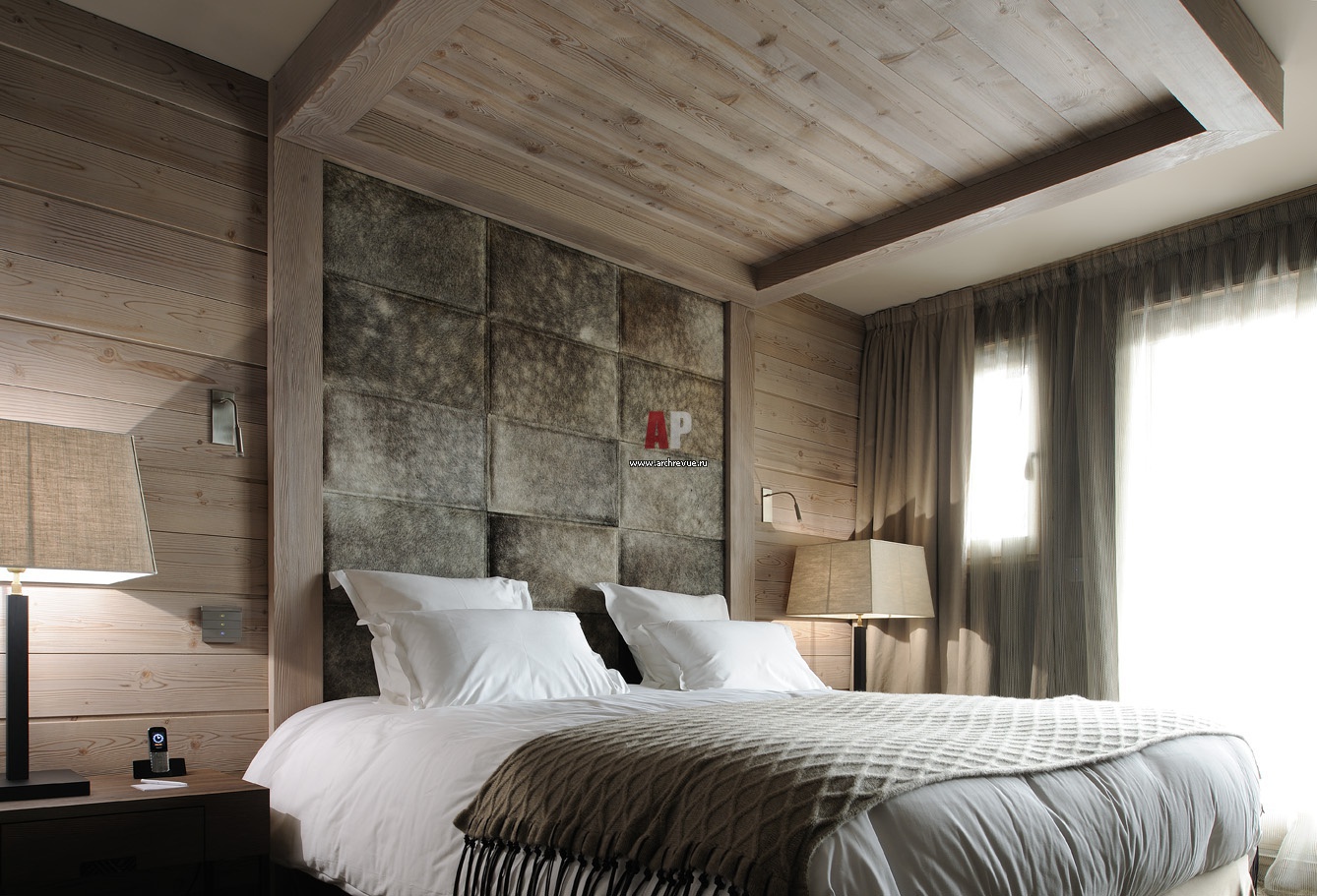 Зона спальни в апарт-отеле. За изголовьем кровати – меховые панели серебристо-серого цвета. В тон к ним подобран вязаный плед и полупрозрачные шторы.
