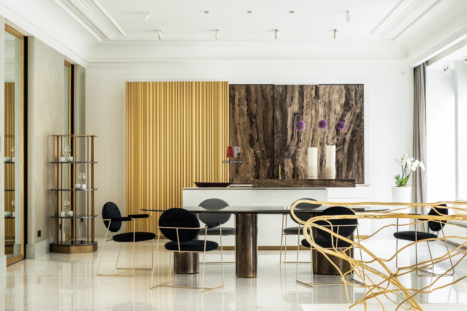 Столовая группа с золотыми акцентами. Стол, стулья, Baxter. Стеллаж, Meridiani. Настольные лампы, Guaxs.