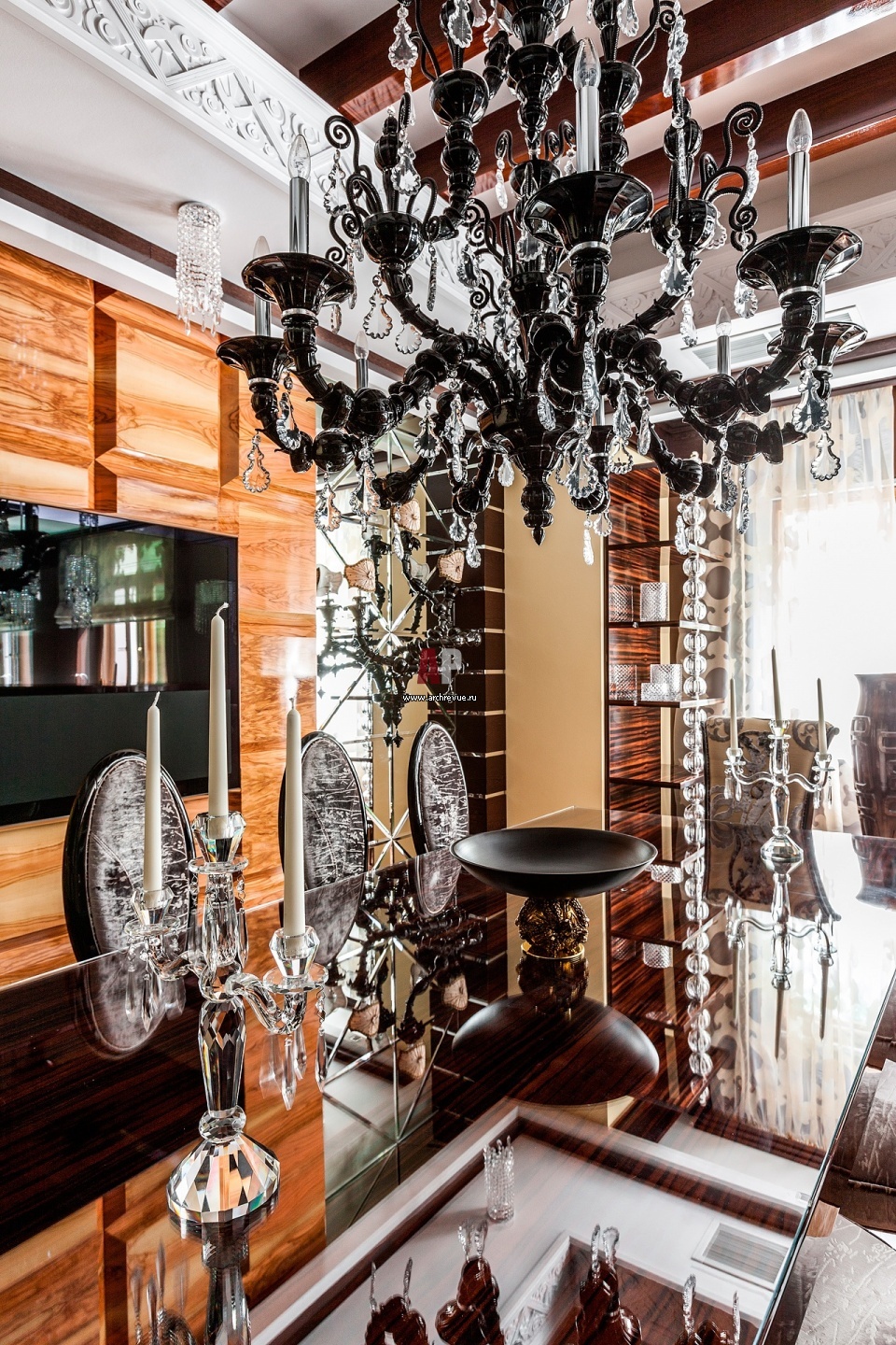 Центральная часть потолка выделена балками из полированного палисандра в обрамлении пышного лепного карниза. Черная люстра, Barovier & Toso.