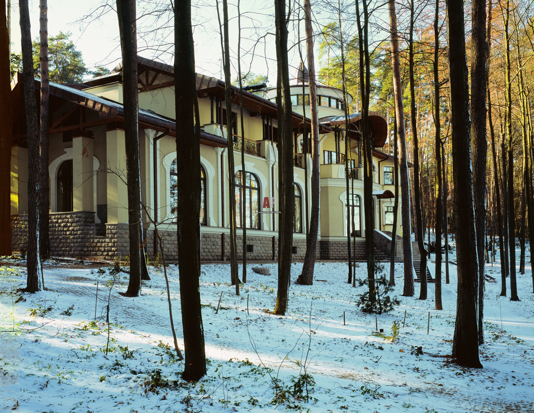 Фасад дома в стиле модерн со стороны парка. Помимо основного дома на участке есть небольшой флигель (250 кв. м).