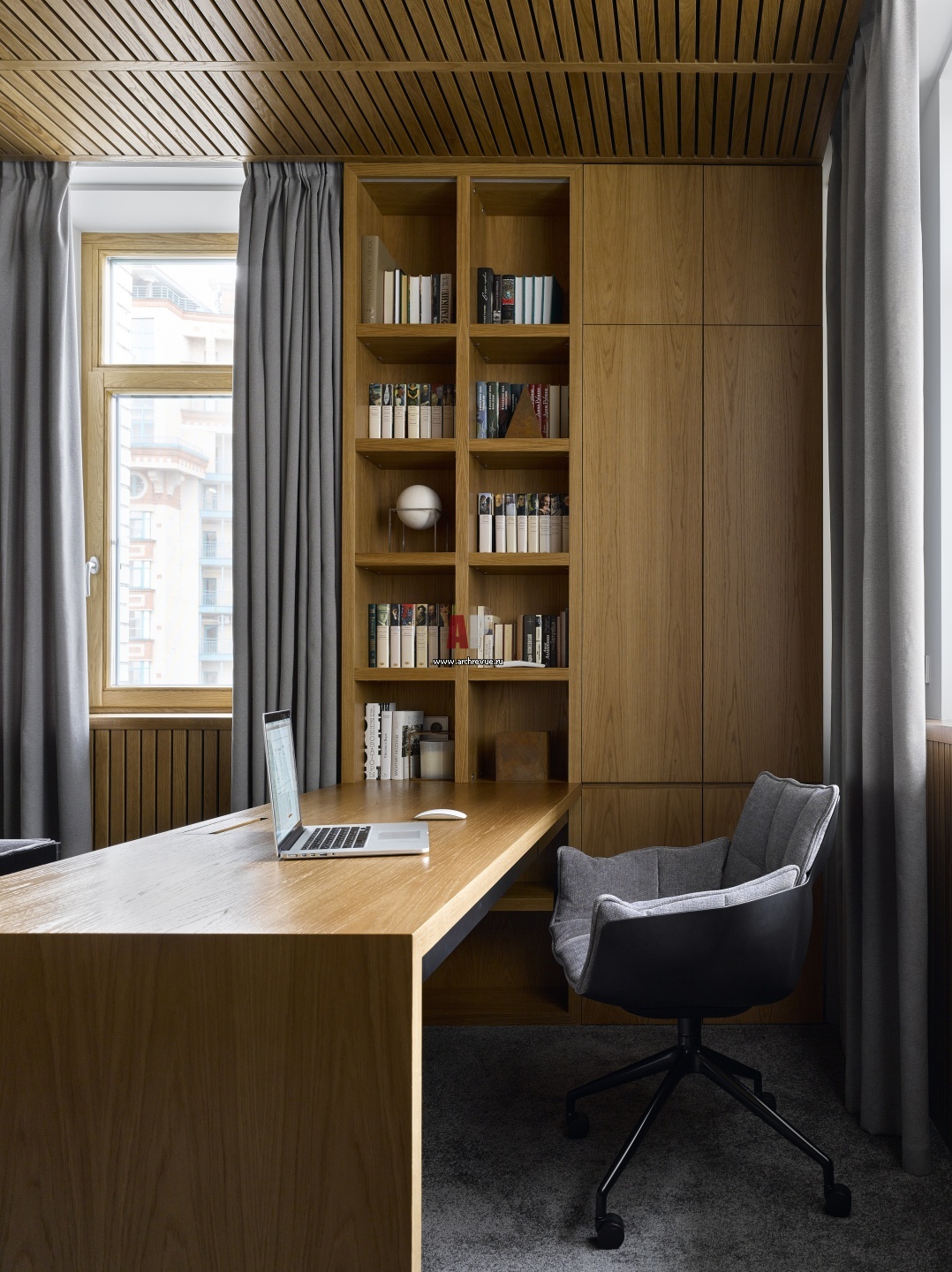 Кабинет отделен деревом медового цвета. Стеновые панели, стеллаж рабочий стол и потолок сделаны на заказ. Рабочее кресло, B&B Italia, модель Hask.