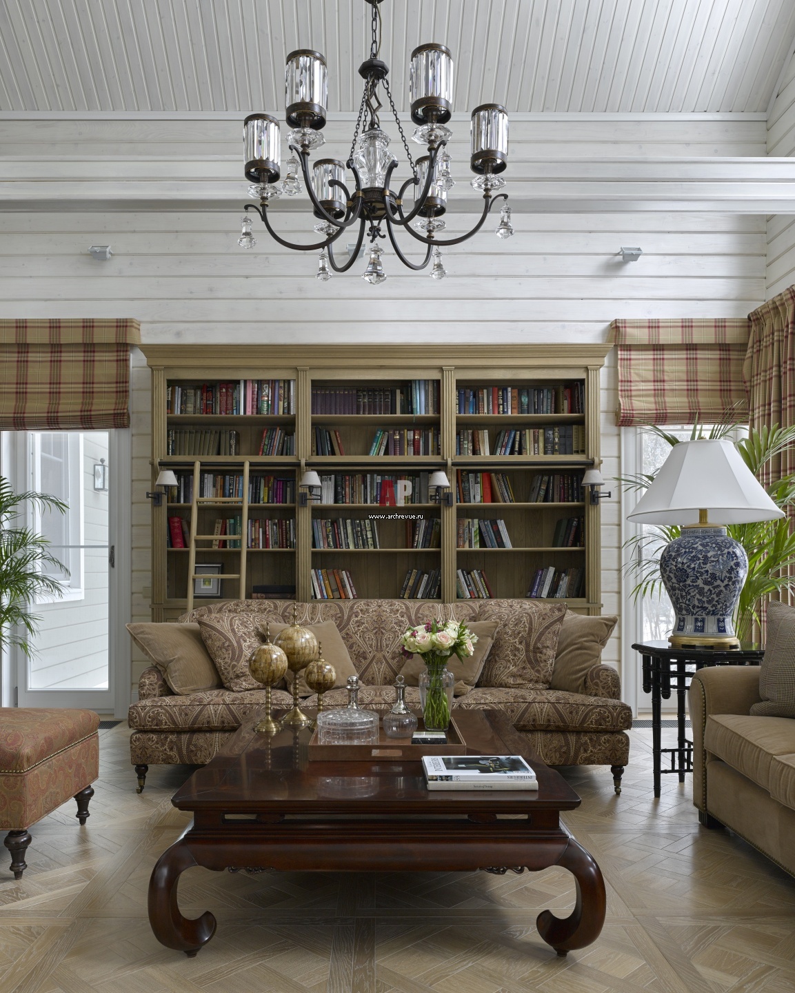 Интерьер дома в колониальном стиле. В гостиной по другую сторону от камина расположена библиотека. Библиотечный шкаф со скрытой подсветкой, Flamant.