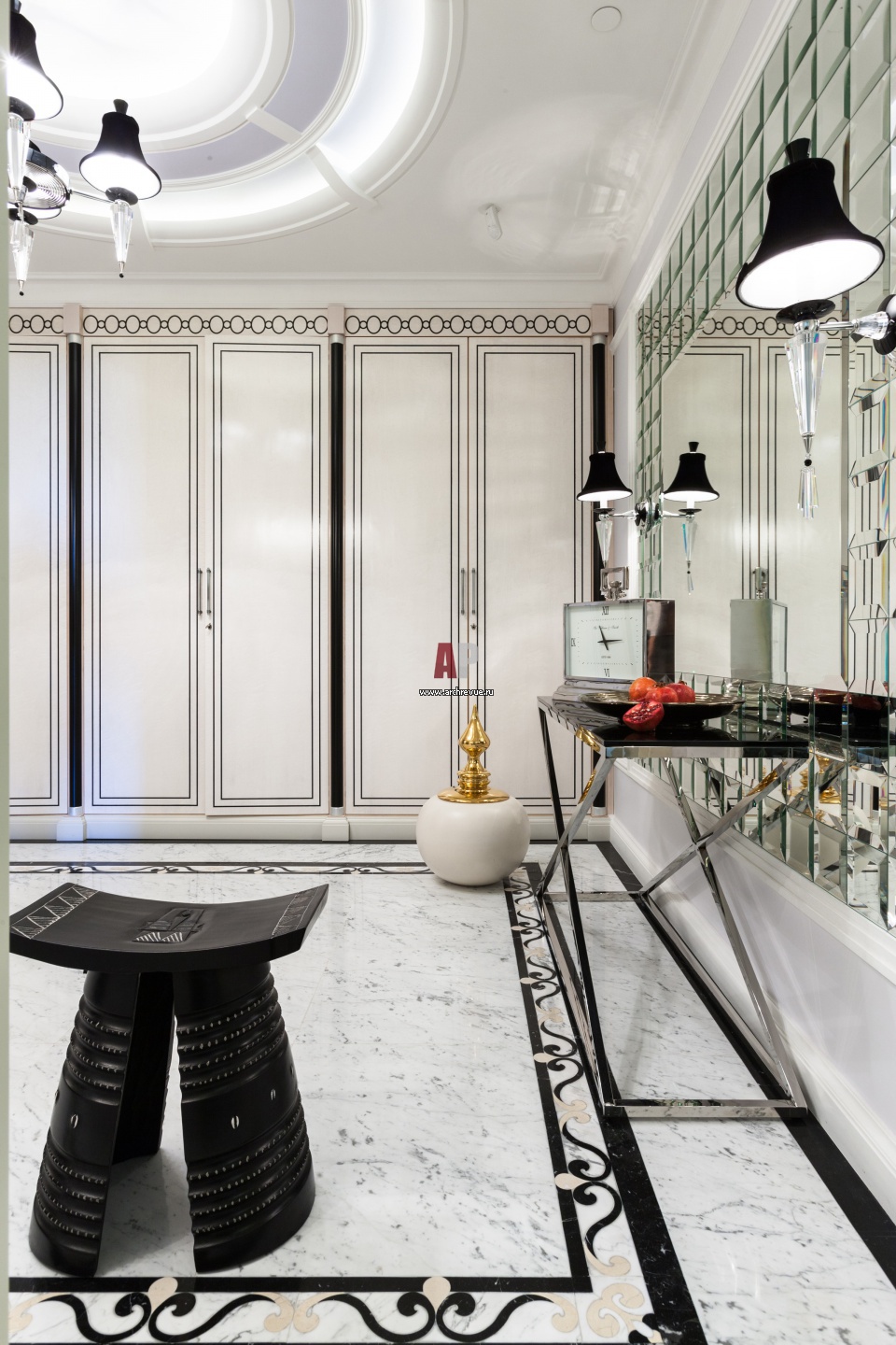 Интерьер белого холла в стиле ар-деко. Встроенные белые шкафы украшены декоративным фризом с графическим орнаментом и тонкими черными пилястрами с серебрением. Форма декоративного потолочного плафона выполнена в эстетике американского ар-деко.