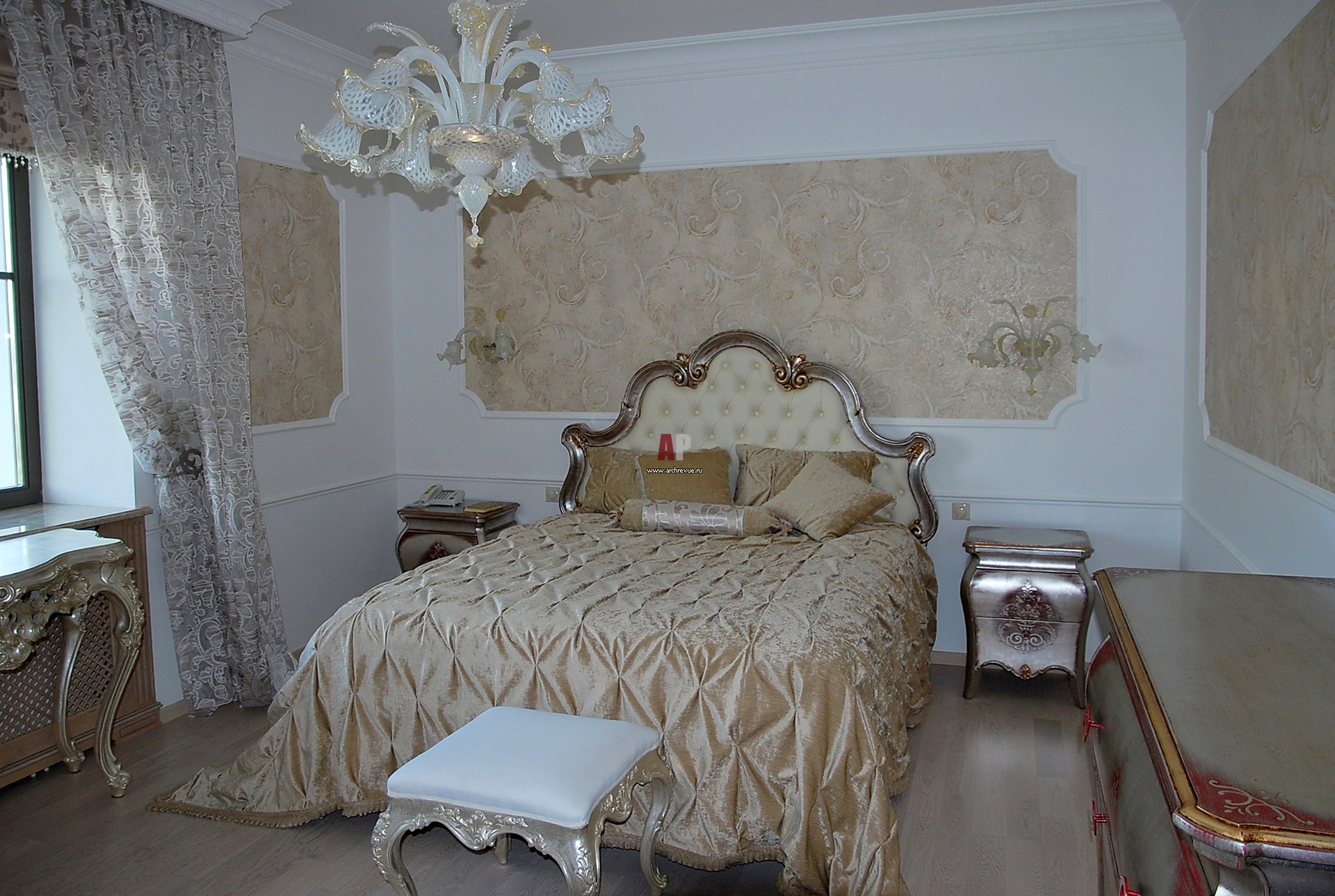 Фото интерьера гостевой спальни в стиле классика. Интерьер выполнен в бежевых тонах. Стены оформлены гипсовыми раскладками со вставками из обоев, имитирующих роспись.