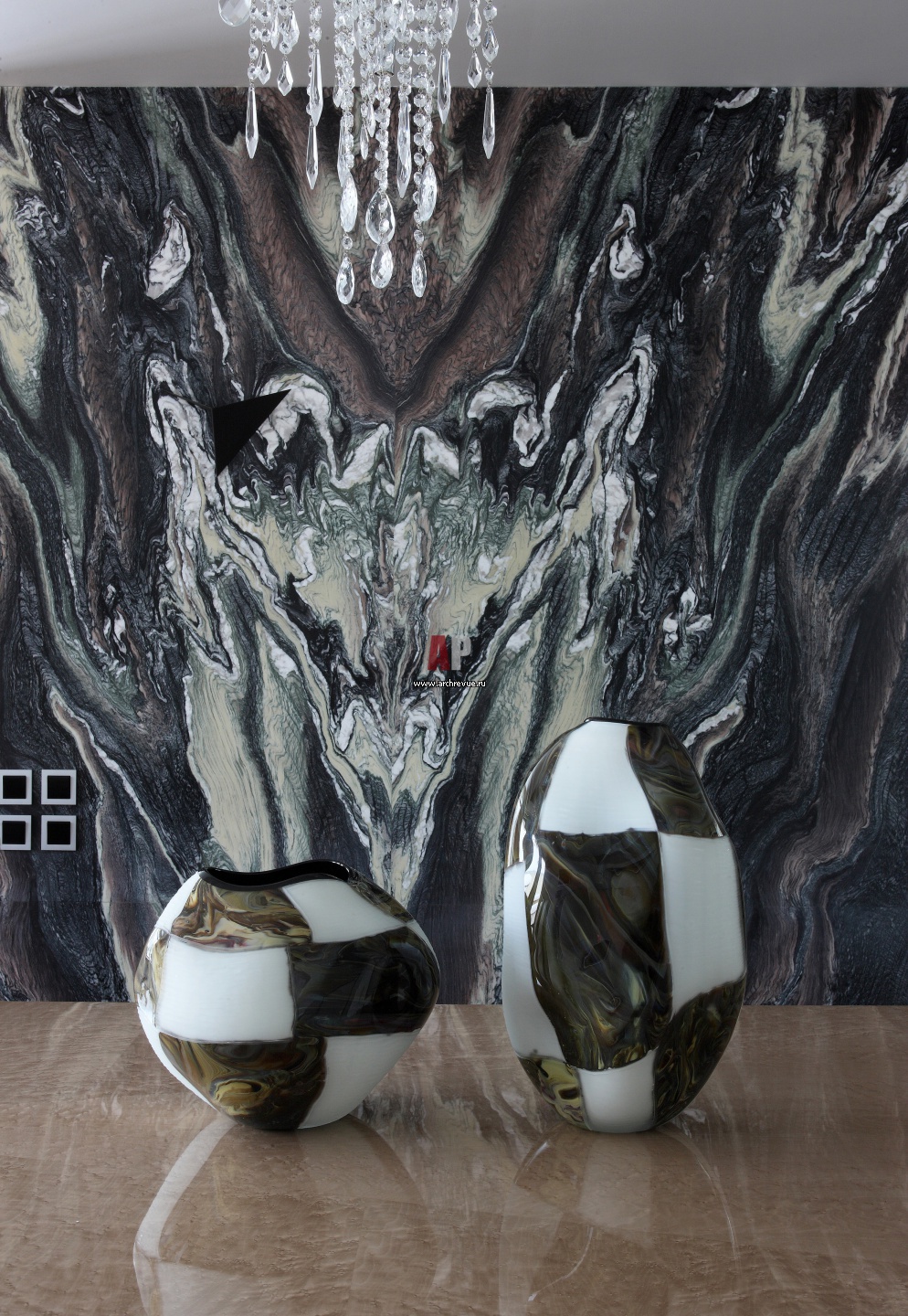 Обстановку роскоши и достатка создают качественные материалы и технологичные решения. Пилон облицован каменными панелями, использован элитный мрамор Cipollino Ondulato.