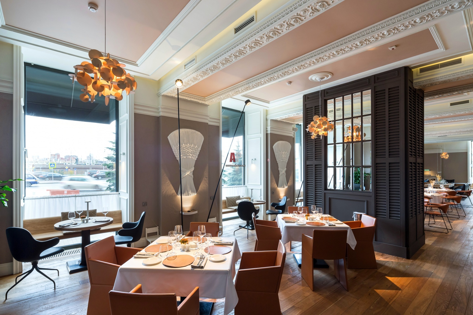 Интерьер зала ресторана с элементами скандинавского дизайна, советского стиля и дворянских интерьеров.