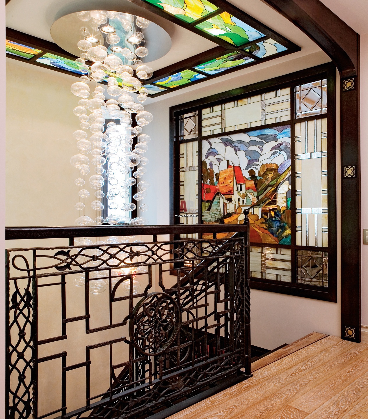 Ограждение лестницы выполнено из кованого металла, покрытого финишными покрасками. В основе его рисунка – орнамент ташкентских мечетей.