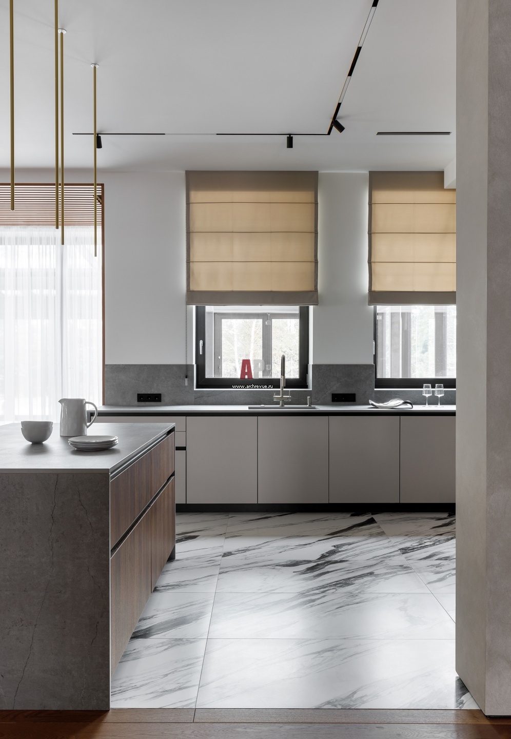 За островом располагается основная линия кухни с мойкой напротив окна, электрической плитой 900мм и двумя вытяжками над ней. Благодаря отсутствию верхних шкафов гарнитур выглядит более легким и воздушным. Заканчивают линию кухни мебельные колонны с встроенными холодильниками.