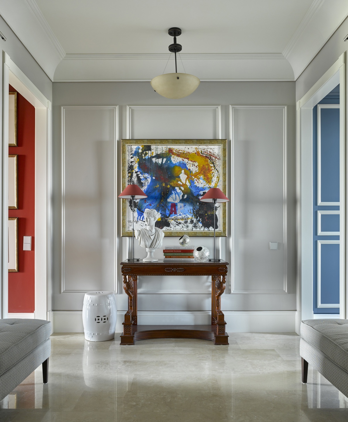 Холл выполнен в нейтральной колористике. Синий коридор справа ведет в госитную, красный слева – в приватную часть квартиры. Настольные лампы, Stéphane Davidts. Картина «Кармен-сюита» художницы Лики Волчек. Плоскость стен организована с помощью тонких молдингов от Orac Decor, поставщик «Ампир Декор».