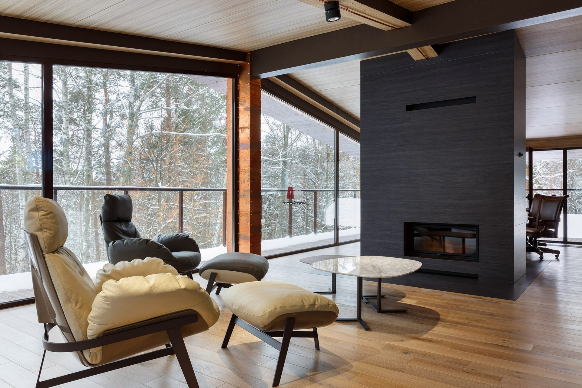 Акцент мансардного этажа – камин, облицованный керамогранитом с фактурой сланца. Кресла, Arketipo.