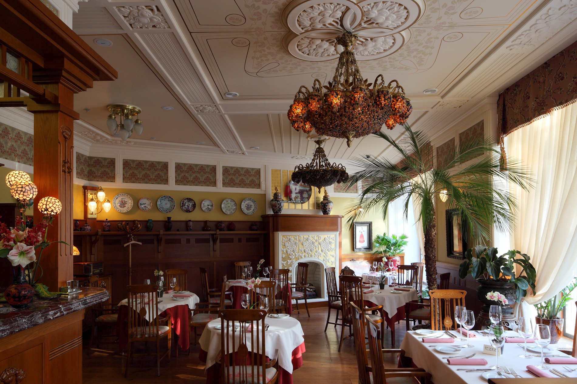 Зал ресторана. На стенах – дубовые панели, художественные росписи, обои ручной работы. Возле витражного окна – камин. Его портал выполнен из дерева и украшен лепным растительным декором с позолотой.