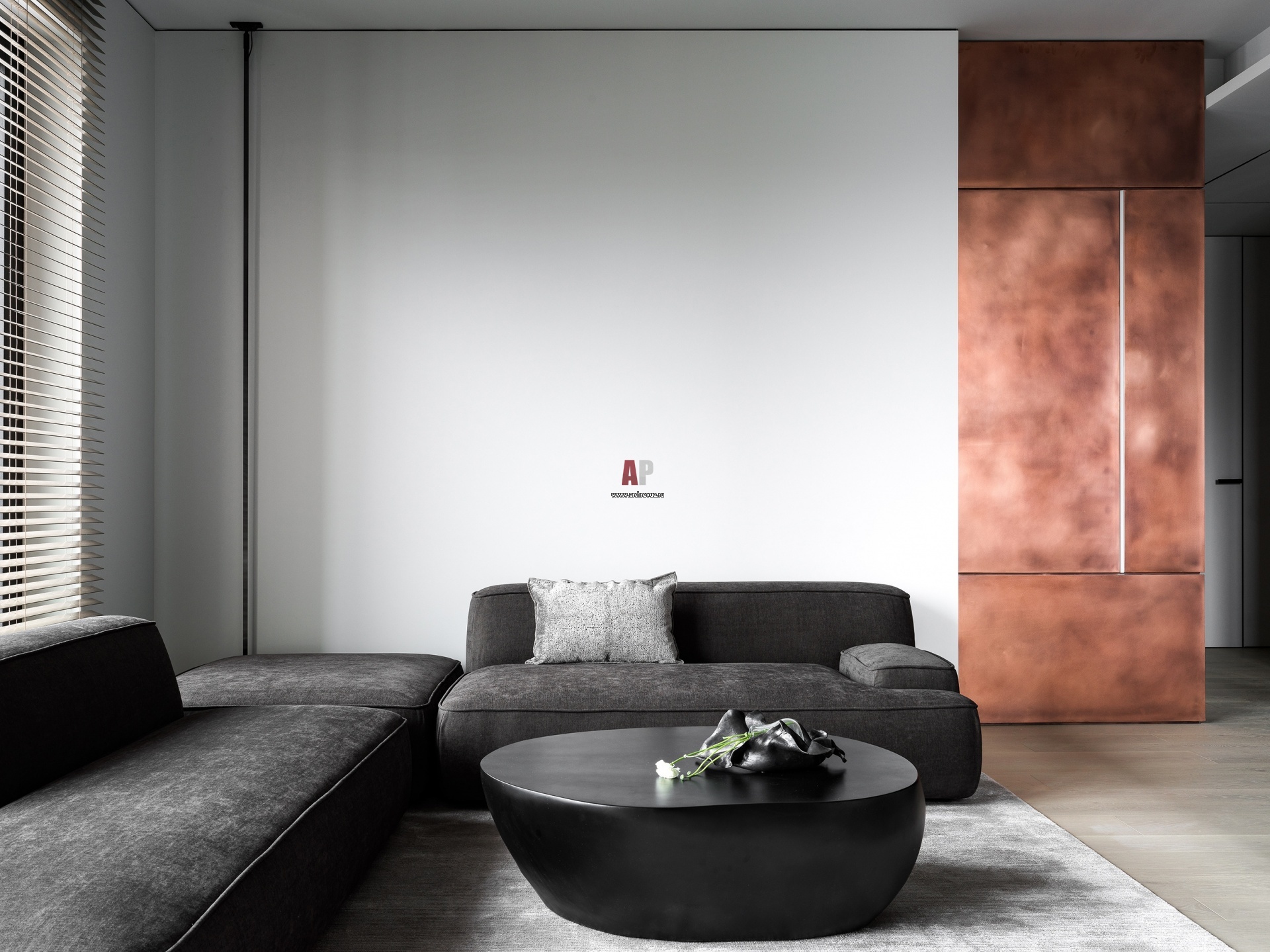 Мягкая группа в гостиной. На стене за диваном Lema проходит тонкий линейный светильник Сentersvet, создающий графику со световой полосой. Объем также формируют медные панели, выходящие из прихожей.