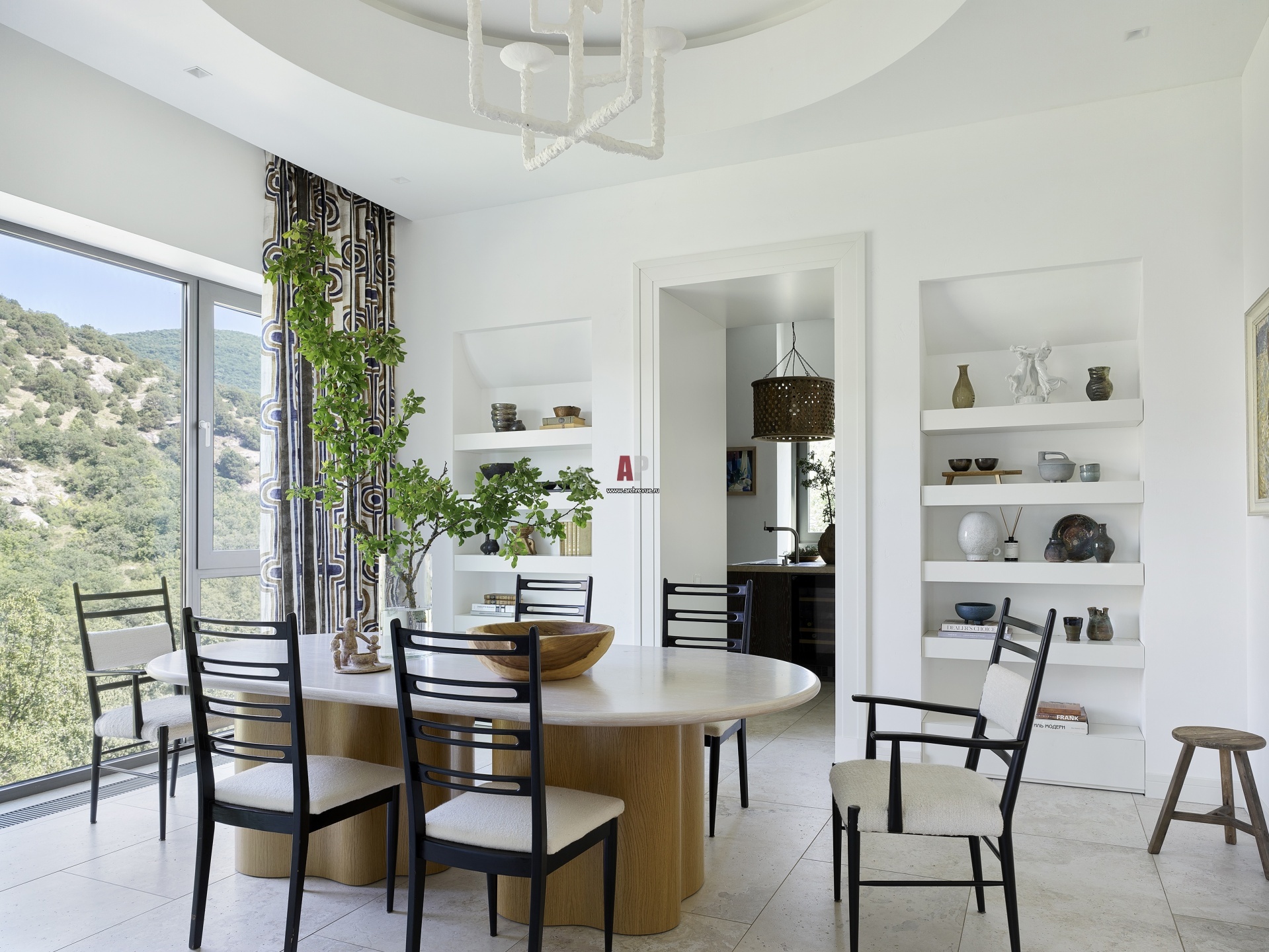 Столовая. Обеденный стол, по эскизу дизайнера – изготовление MOss Furniture. Стулья двух типов (с подлокотниками и без), винтаж, Дания, 1960-е годы. Потолочный светильник из алебастра куплен на антикварном рынке в Париже.