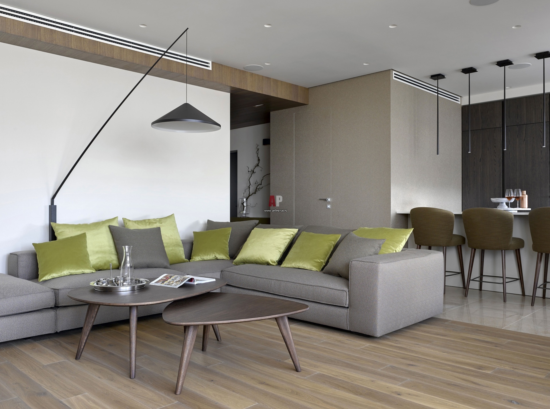 Центральное помещение в квартире – общая гостиная, объединенная с кухней. На полу гостиной – половая доска с состаренной фактурой, она выглядит грубой, брутальной. Диван, Art Nova, модель Shaby. Журнальные столики из ясеня, на заказ, изготовление «Ассоциация русских мастеров».