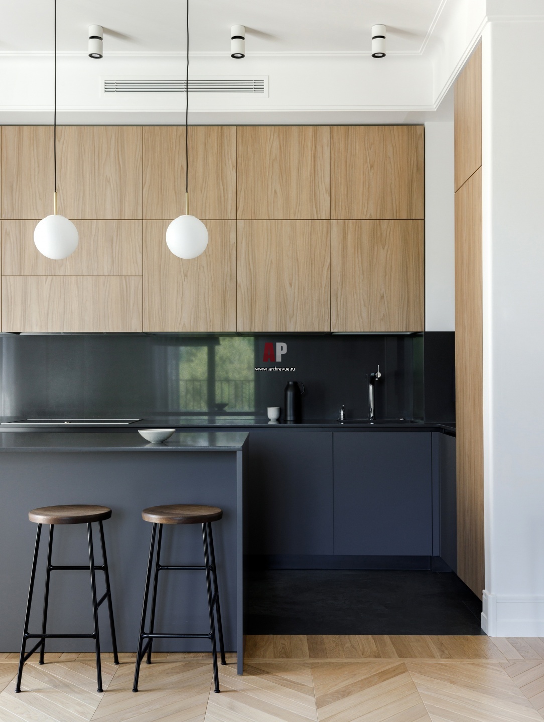 Сделать отдельную кухню в данном проекте не позволили особенности конструктива и расположение окон, а также пожелание заказчиков о едином пространстве, но кухонный блок удалось разместить в стороне от открытого общего пространства. Кухня, Cesar. Барные стулья, Hay. Светильники, Menu.