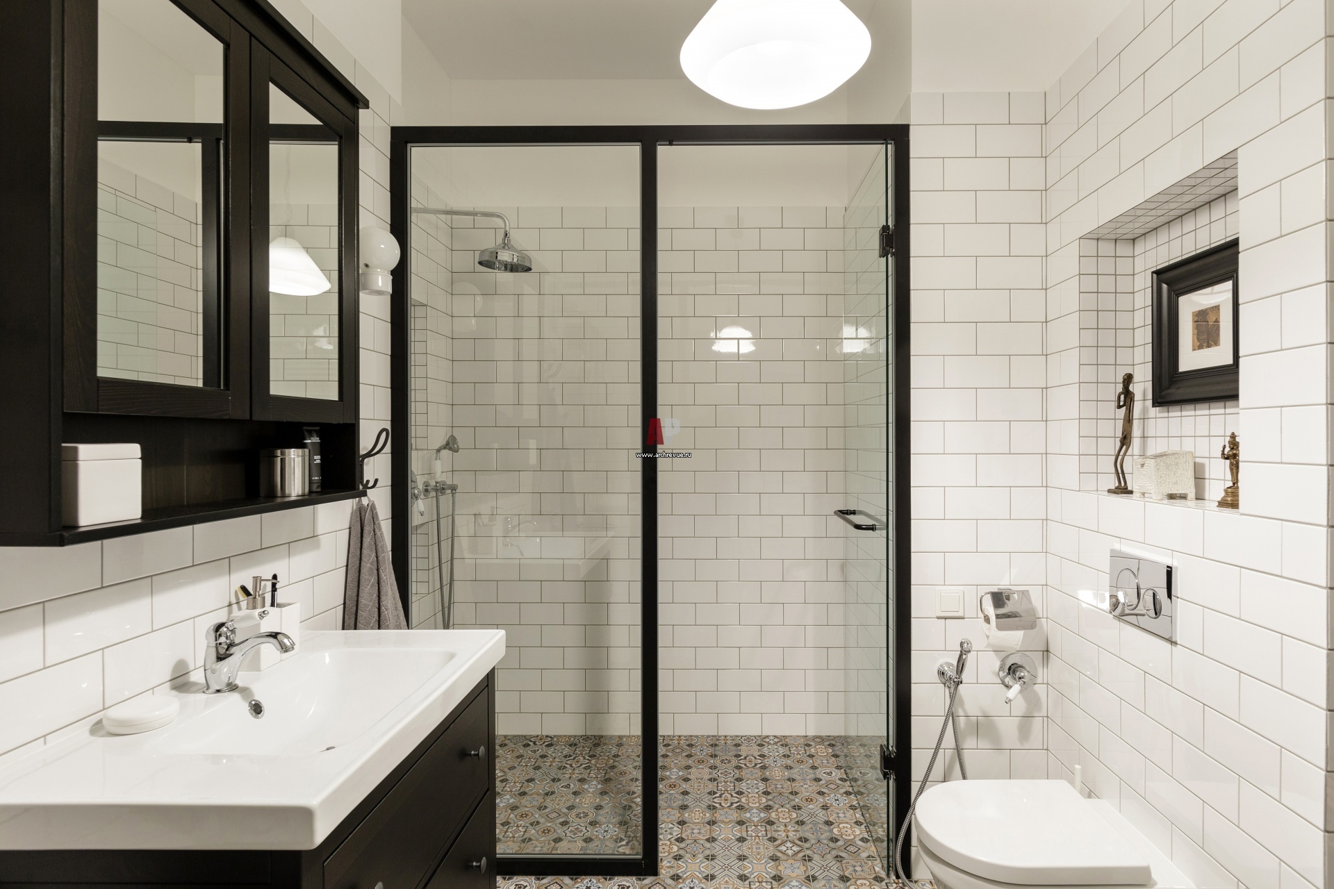 Интерьер ванной комнаты построен на контрасте белой плитки и черной мебели и обрамления стекла душевой кабины. Сантехника, Andrea.