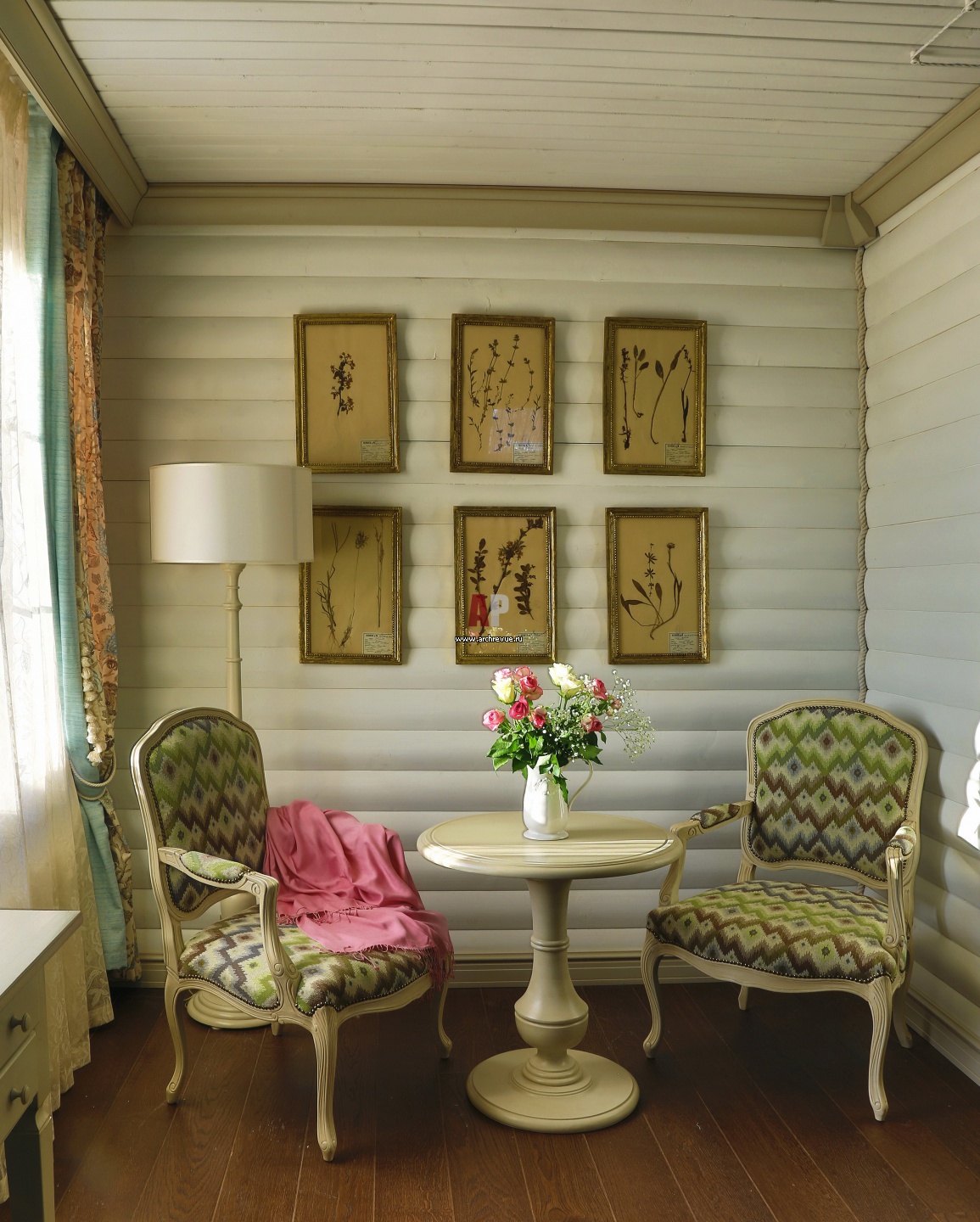 Кресельная группа возле окна в спальне. Кресла, столик, Veranda. Плинтусы на несколько тонов темнее стен. Картины с сухими цветами, Mis en Demeure.