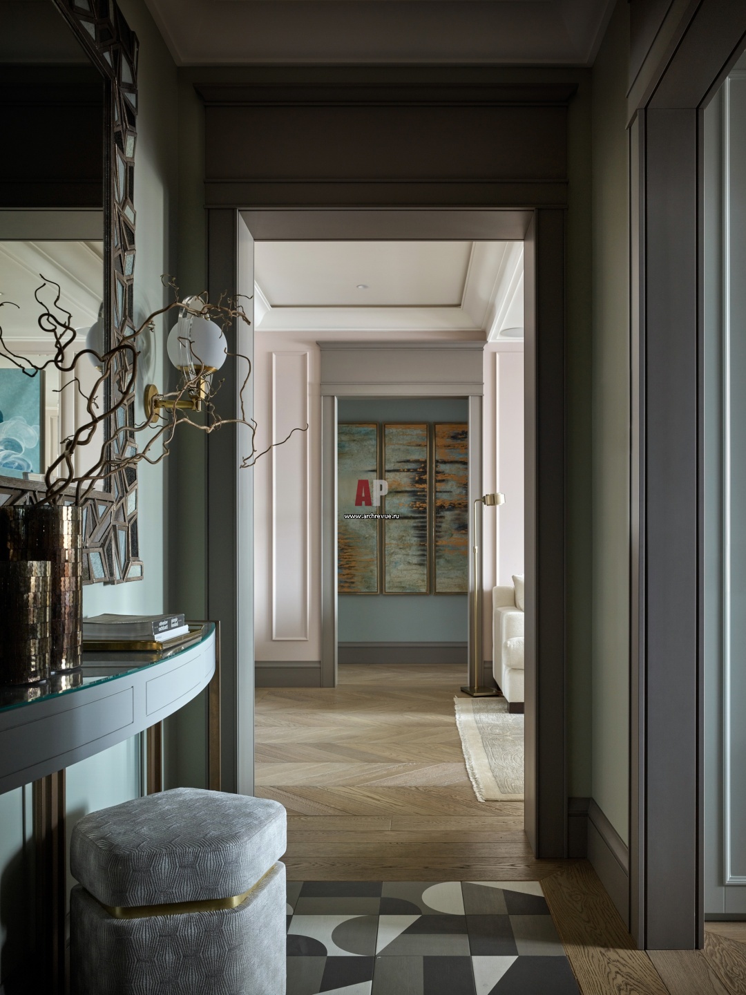 Прихожая оформлена в природных оттенках. Стены краска мятного цвета, Farrow & Ball. На полу – плитка, Mutina, коллекция Puzzle by Barber & Osgerby. Бра, Hudson Valley Lighting.
