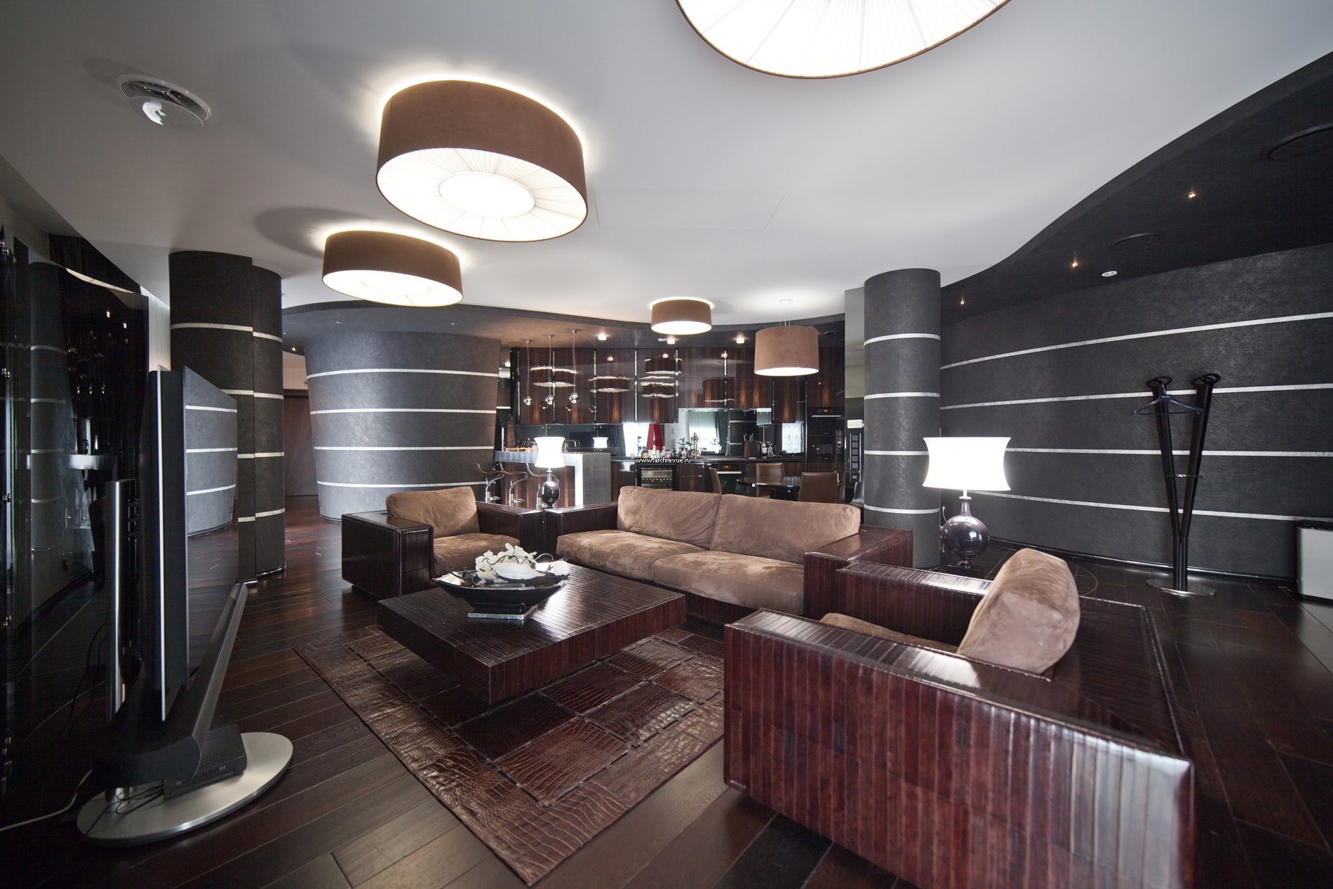 Зона для неформального общения с баром. На стенах – сложные покраски серебристого цвета. Кресла, диван, аксессуары с отделкой из натуральной кожи.