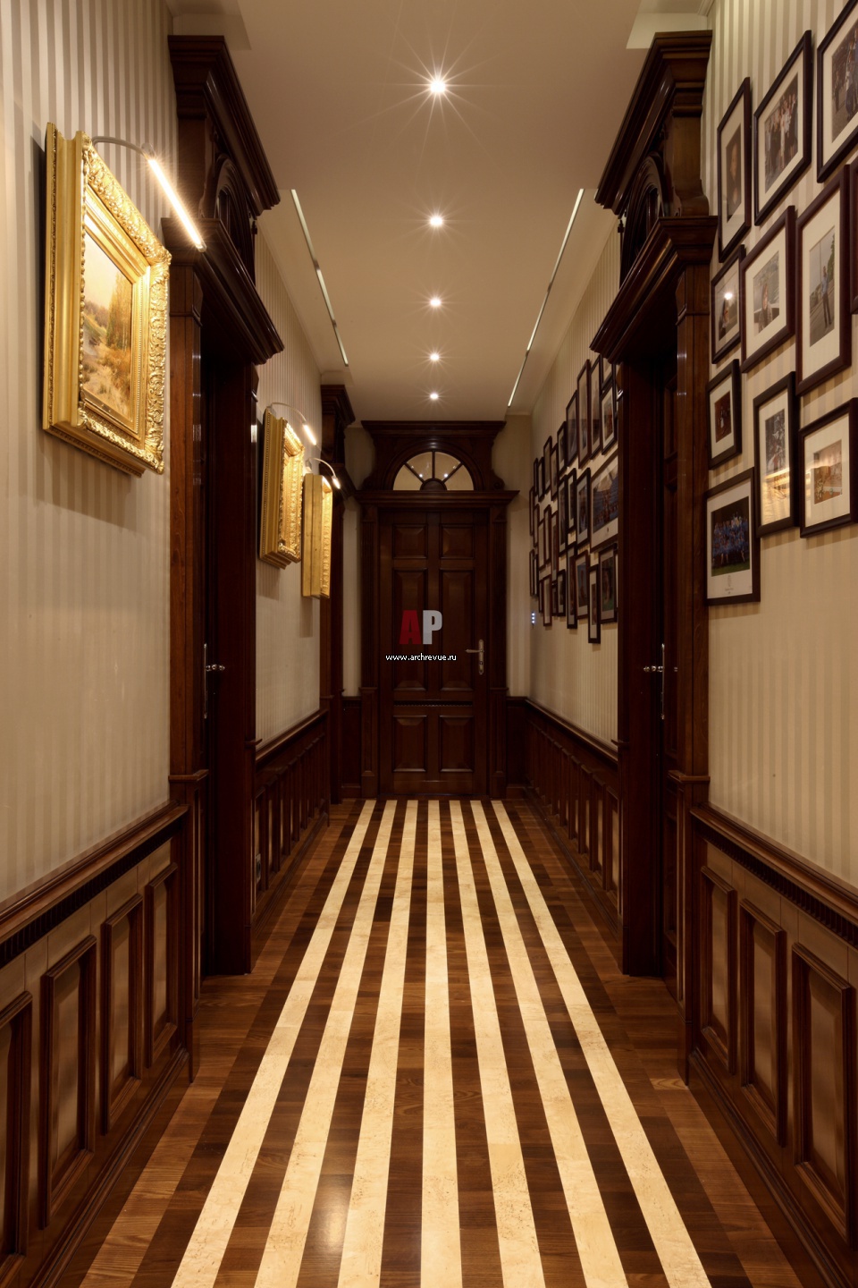Рисунок паркета со вставками из корня карельской березы, поставщик «Ковчег-паркет», придает пространству динамики. Двери в приватные помещения оформлены резными деревянными порталами.