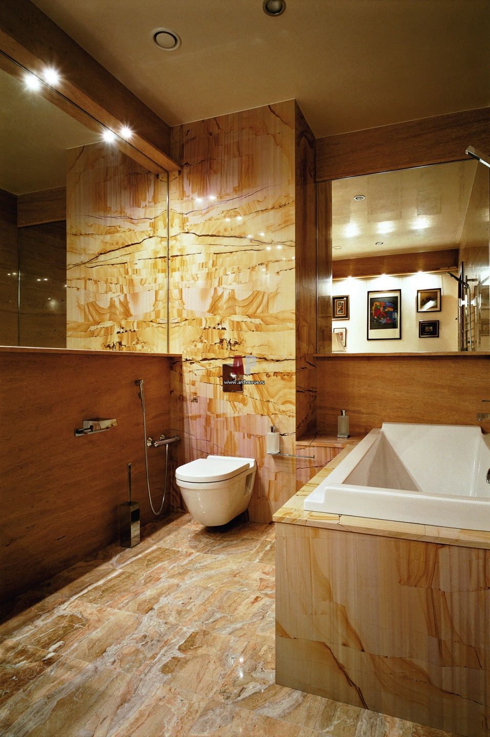 Фото интерьера санузла. Помещение оформлено мрамором с живописной текстурой, поставщик «Галерея камня».