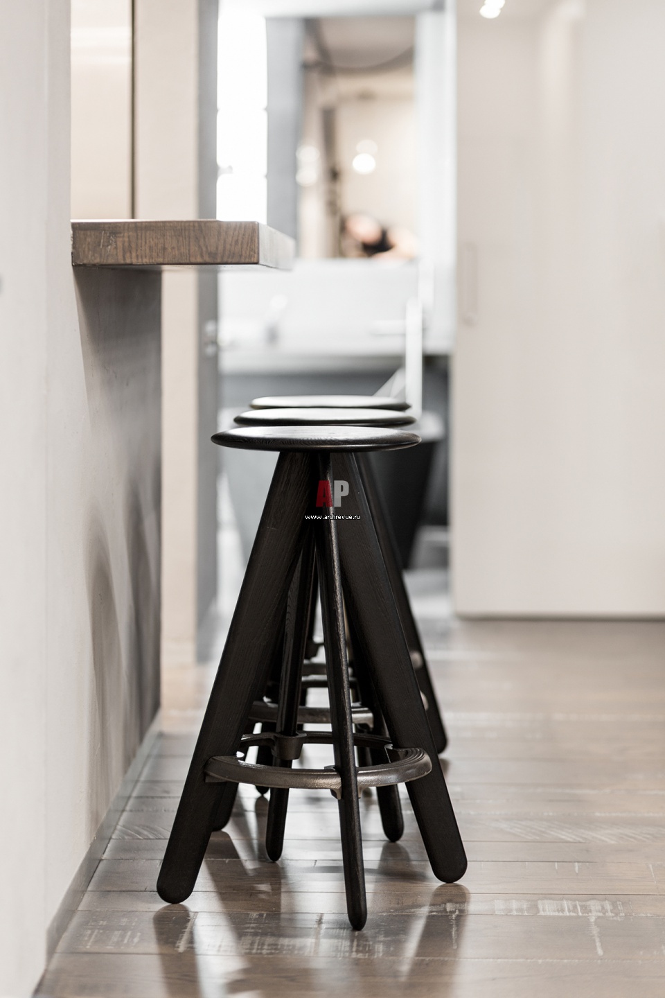 Интерьер барной стойки в квартире-лофте. Барные табуреты сделаны из темного дерева с коваными ободами для ног.