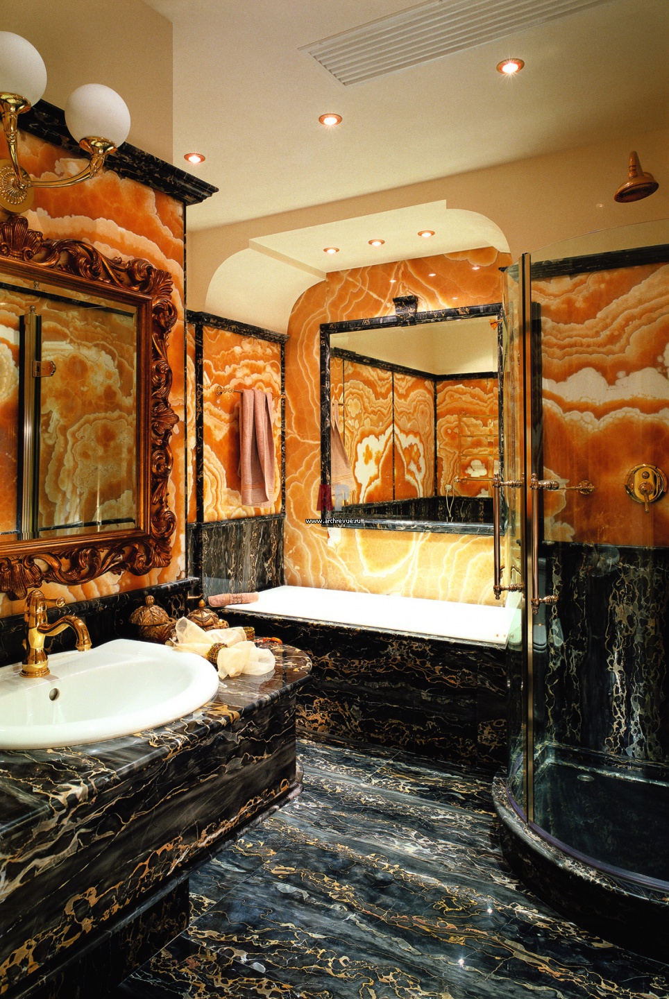 Хозяйская ванна выполнена в стиле величественной классики. Помещение облицовано двумя видами мрамора: бежевым и изумрудно-зеленым с золотыми прожилками. Классическую стилистику поддерживает золотой декор. Сантехника Villeroy & Boch.