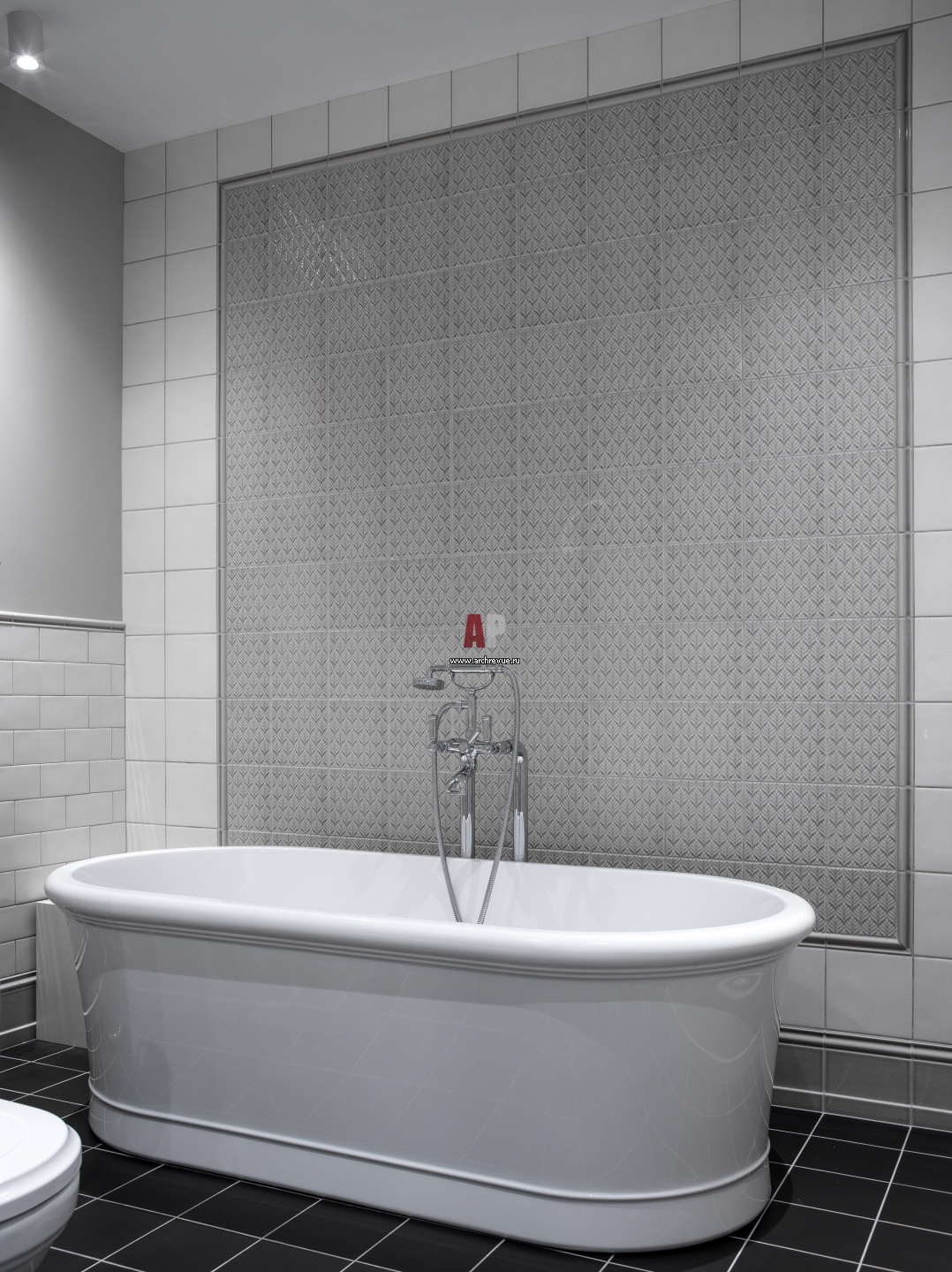 Детский санузел. Настенная плитка, Ceramiche Grazia. Ванна из искусственного камня, Salini, модель Elia. Напольный смеситель, Bossini, модель Liberty.