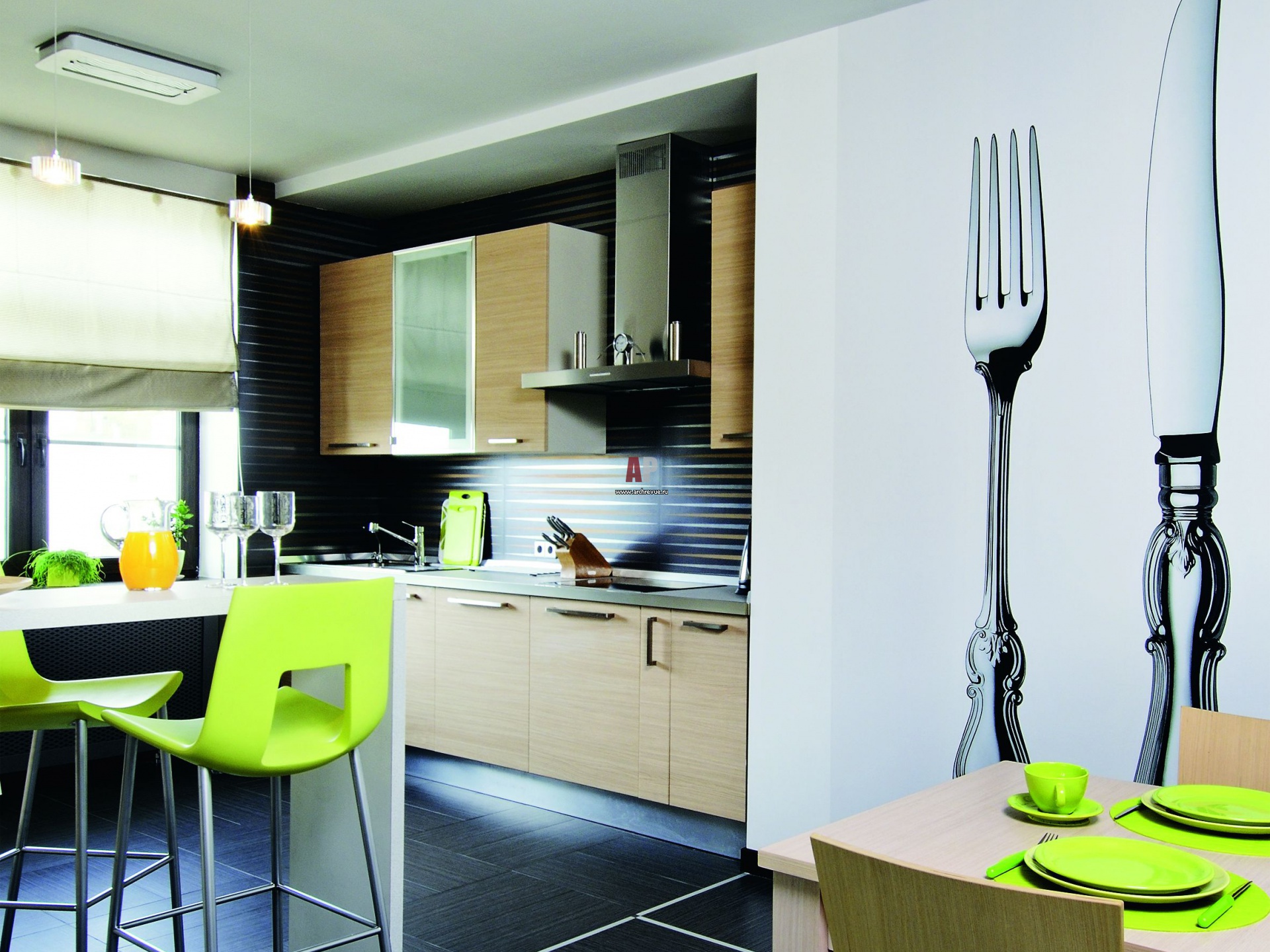 Кухня исполнена в стилистике поп-арта. Этому служат оригинальные обои со столовыми приборами и яркая посуда.