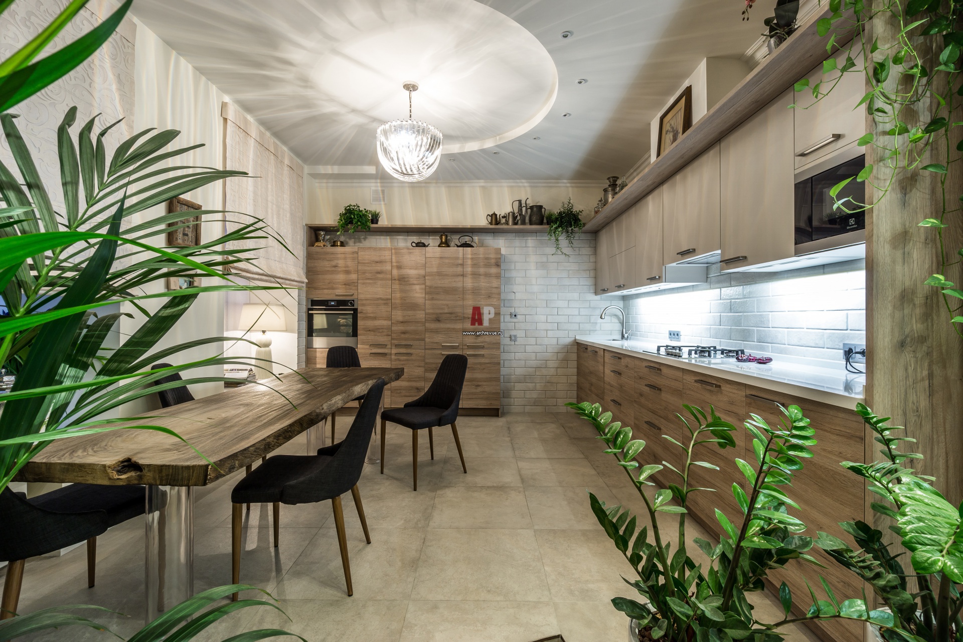 Кухня-столовая объединена с гостиной и вынесена на небольшой подиум. Кухонный гарнитур Leicht, поставщик ECLECTIC group, включает в себя две программы фронтов: SYNTHIA - ламинат с фактурой античного дуба и CERES - ламинат в цвете мохер.