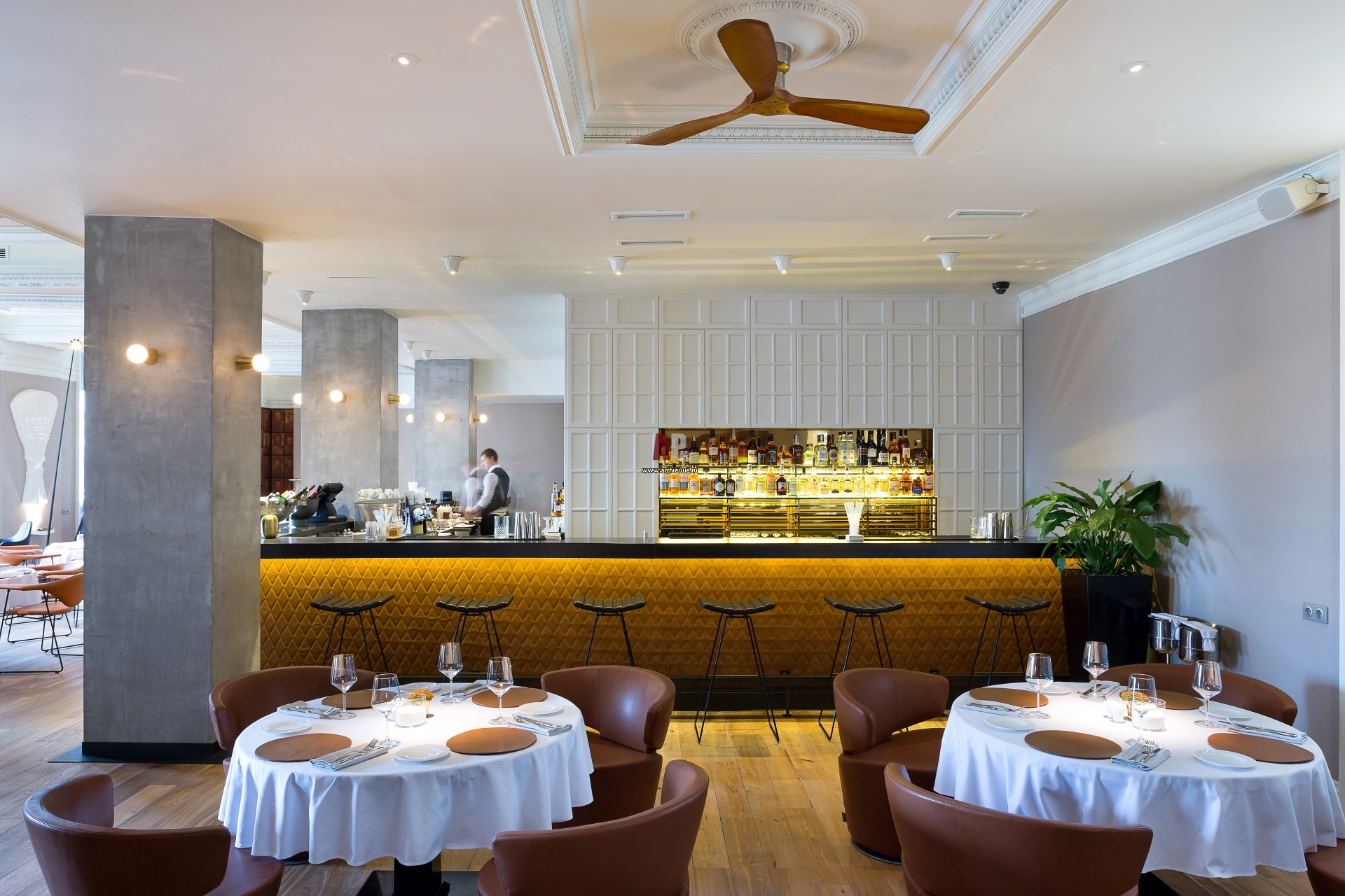 Барная зона ресторана Kutuzovskiy 5. Две стены за баром зашиты белыми деревянными панелями с филенками в неоклассическом стиле.