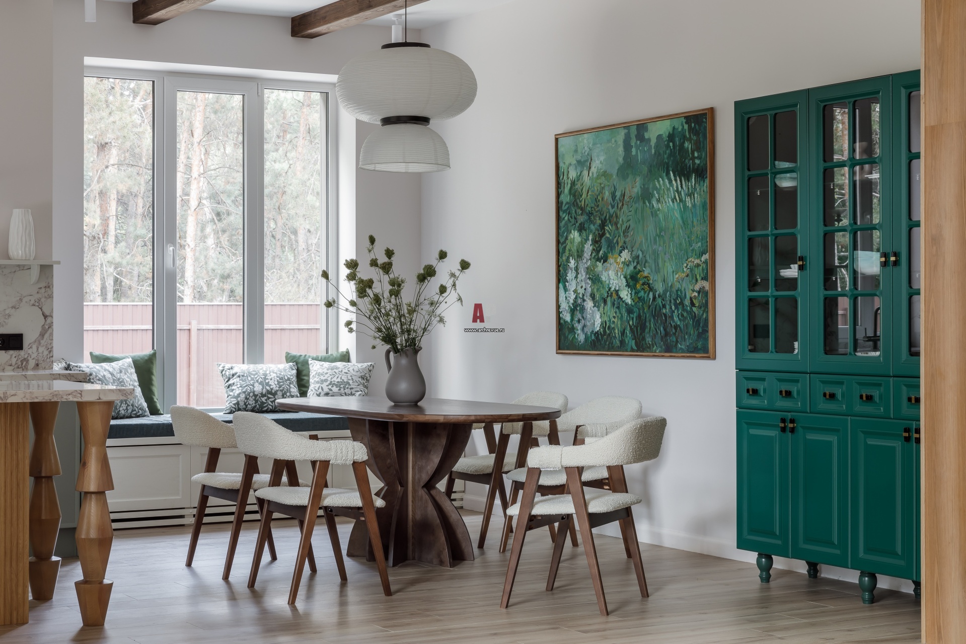 Справа от кухонного гарнитура расположена столовая зона. Рядом с обеденным столом – контрастный сине-бирюзовый буфет с красивой посудой для сервировки стола.