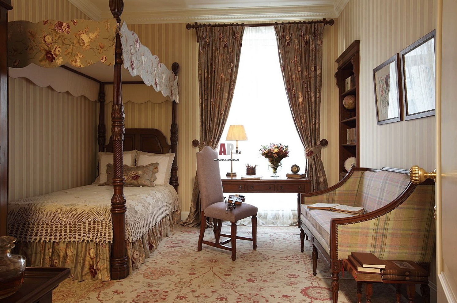В спальне старшей дочери установлена кровать с балдахином, Ovation. Остальная мебель также изготовлена на этой же фабрике на заказ.