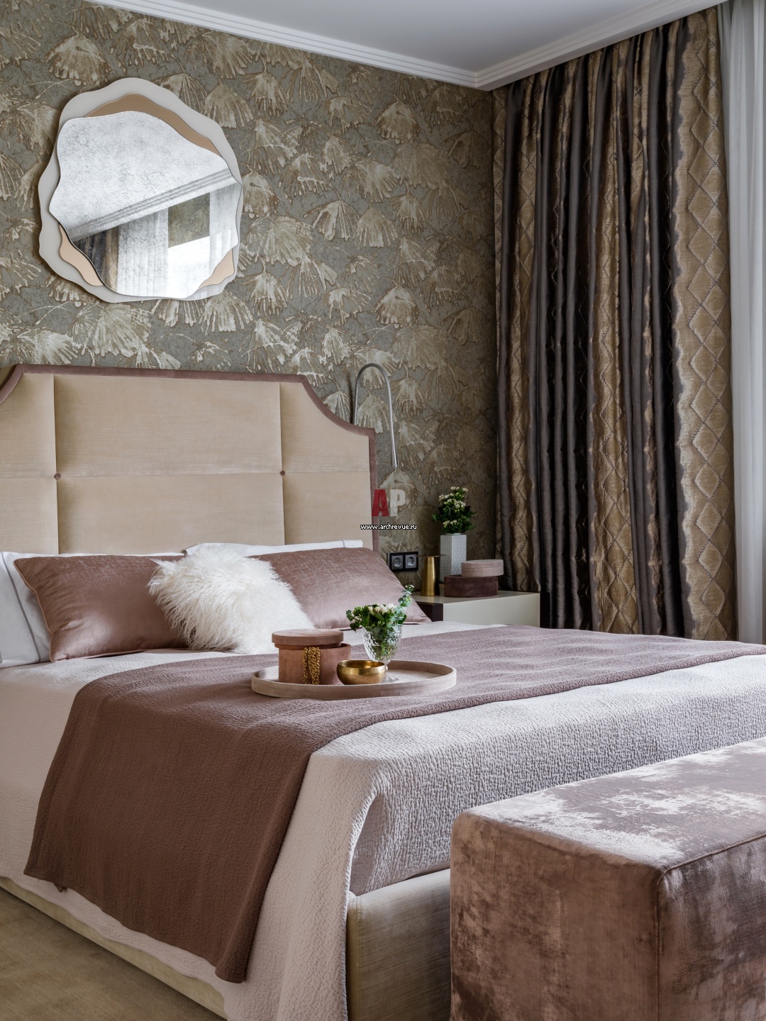 В детской дочери нет привычных розовых оттенков, она выполнена в той же элегантной стилистке, что и «взрослая» часть квартиры. Кровать и пуф, Inedito Milano. Панно из трех видов зеркала изготовлено на заказ по эскизам автора проекта.