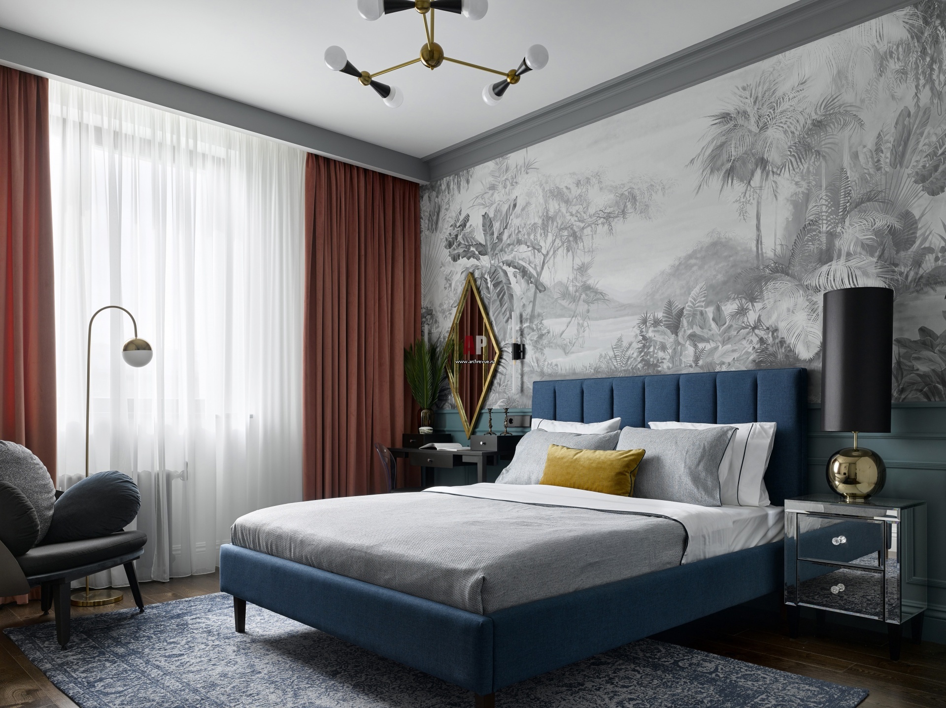 Акцент спальни – черно-белые обои Affresco с тропической тематикой. Кровать в обивке темно-синим текстилем, Laska Family. Центральная люстра, Jonathan Adler, модель Caracas.