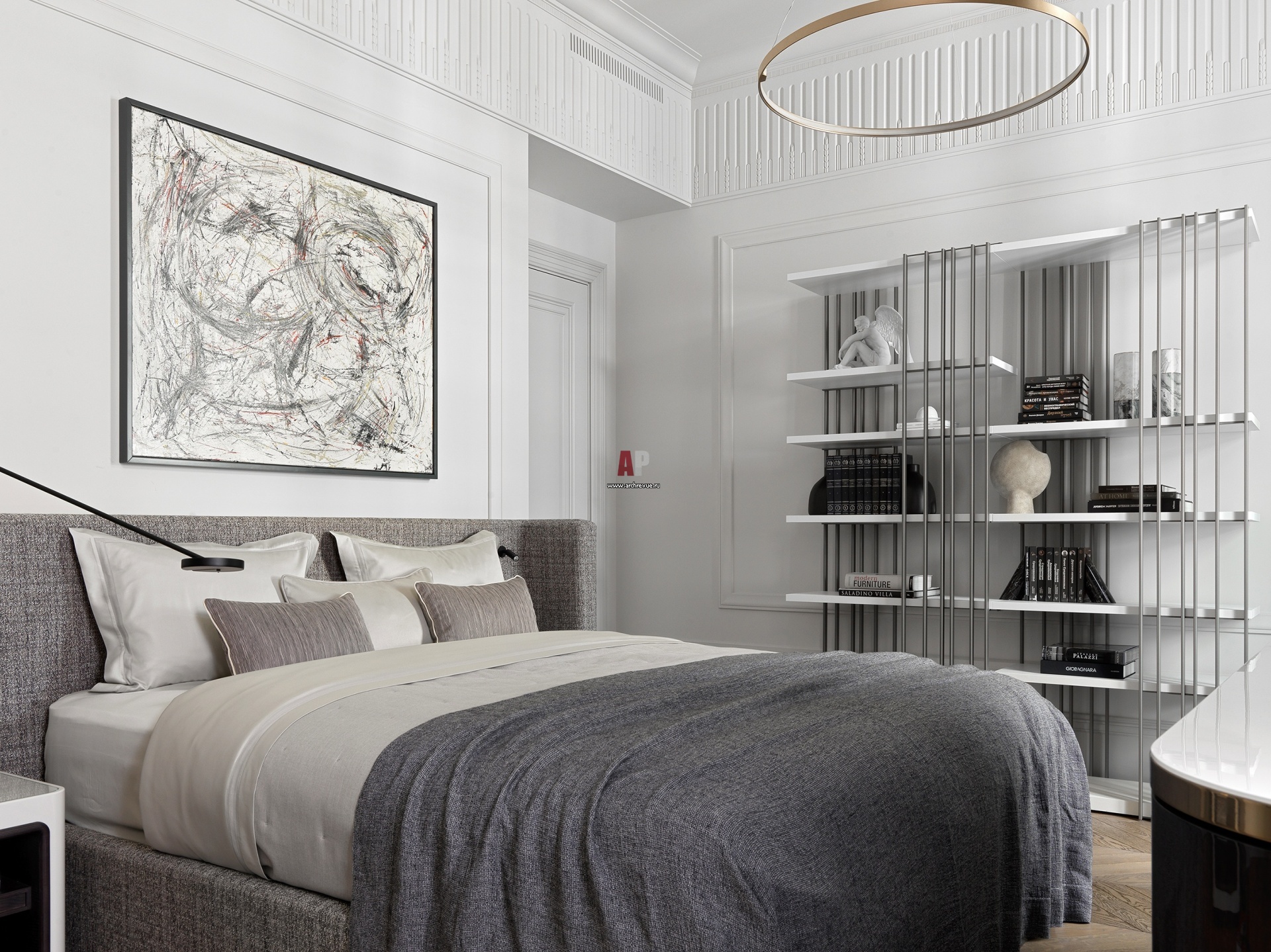 Хозяйская спальня. Потолочные светильники, Reggiani. Стеллаж, Cattelan Italia. В орнаменте гипсового карниза обыграна тема колосьев, отсылающих к профессии владельца.
